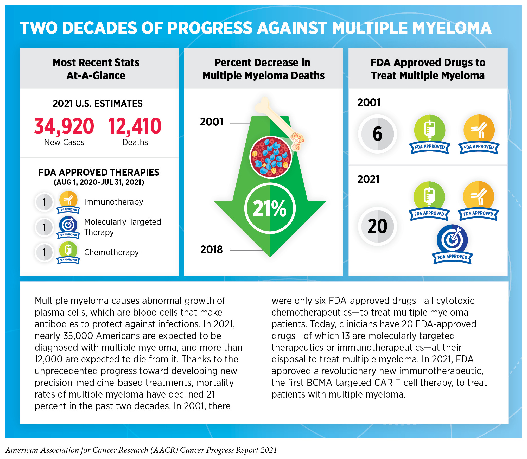 Multiple myeloma is one of the most diagnosed blood cancers in the United States (4)Surveillance, Epidemiology, and End Results (SEER) Program.. Over the last two decades, there has been unprecedented progress toward developing new precision medicine-based treatments for multiple myeloma (see sidebar on Two Decades of Progress Against Multiple Myeloma). Despite the advances, many patients develop resistance to treatment over time and then the disease returns.
