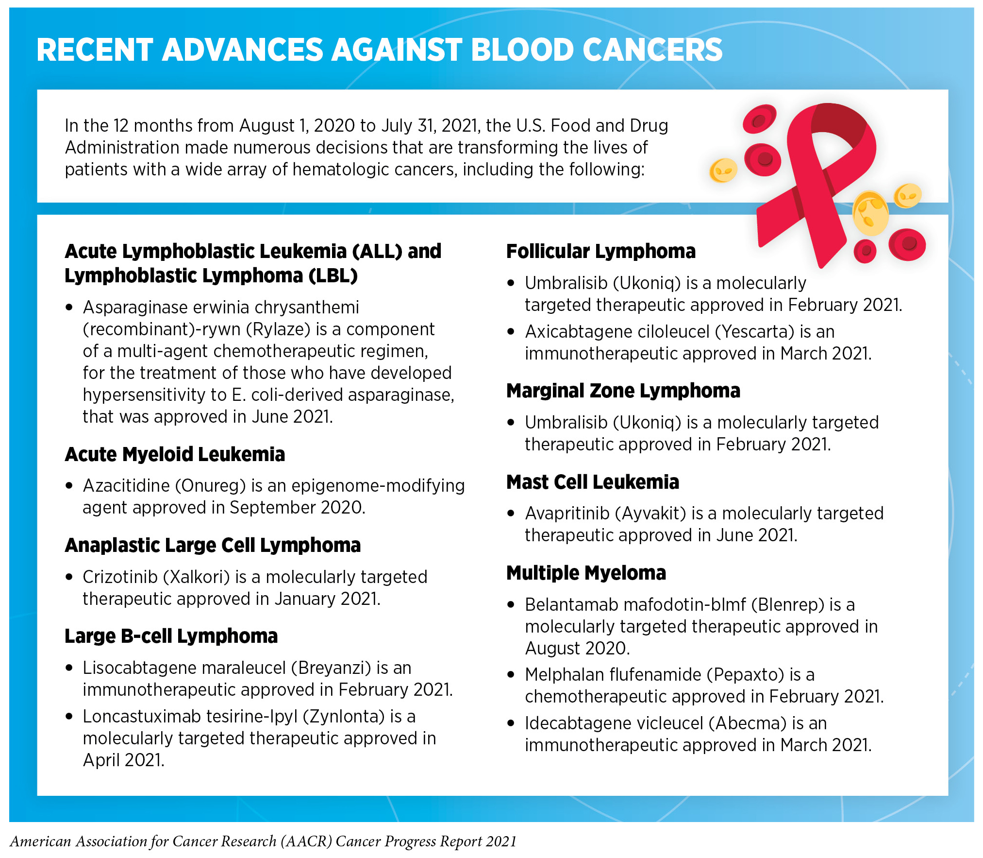 Blood or hematologic cancers arise in the bone marrow where blood is formed, or in cells of the immune system. In the 12 months covered in the report, FDA has made numerous decisions that are transforming the lives of patients with a wide array of blood cancer types (see sidebar on Recent Advances against Blood Cancers). Some of these approvals are expanding treatment options for patients with very rare forms of blood cancers.