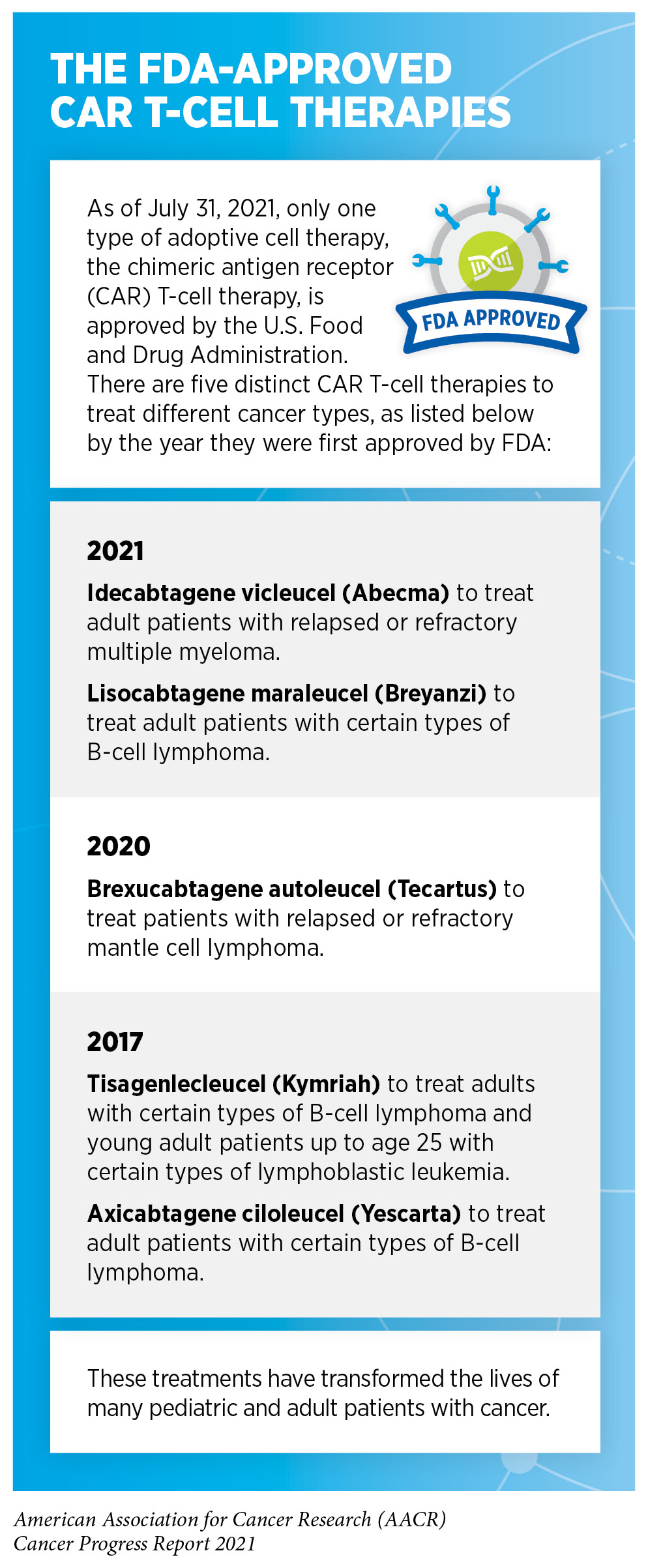 The extraordinary progress toward harnessing the potential of adoptive T-cell therapy for treatment of cancer is underscored by the approval of two new CAR T-cell therapies covered in this report: idecabtagene vicleucel (Abecma) to treat relapsed or refractory multiple myeloma, and lisocabtagene maraleucel (Breyanzi) to treat relapsed or refractory large B-cell lymphoma. During the 12 months covered in this report, FDA also expanded the use of axicabtagene ciloleucel (Yescarta) to treat relapsed or refractory follicular lymphoma. These approvals bring the number of FDA-approved CAR T-cell therapies to five.
