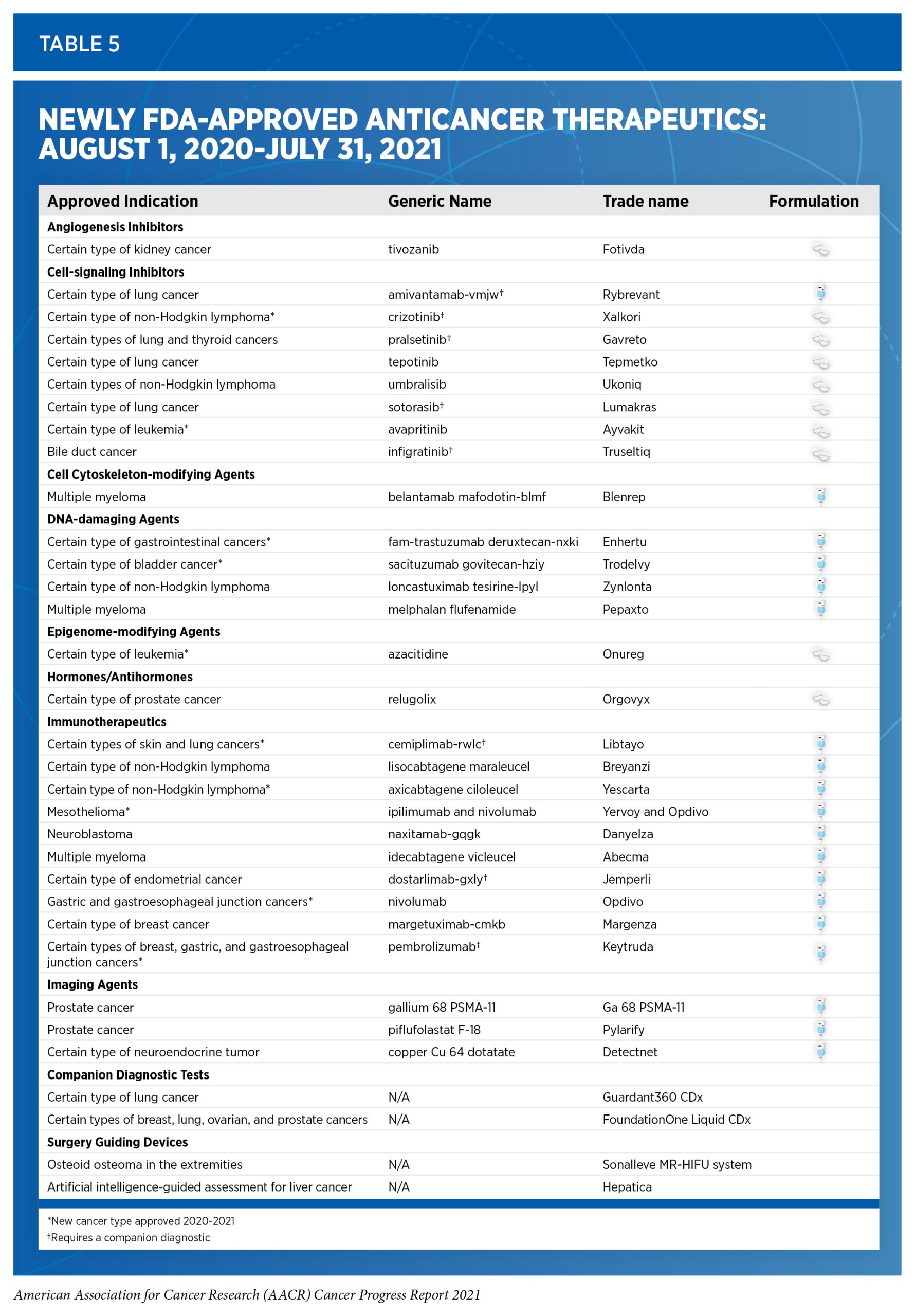 This section primarily discusses 16 new anticancer therapeutics, three new diagnostic imaging agents, and two new medical devices approved by FDA during the time frame—August 1, 2020 to July 31, 2021—covered by this report. Also highlighted are the 11 previously approved anticancer therapeutics that were approved by FDA for treating additional types of cancer during the same time (see Table 5 and Supplemental Table 4). Not discussed are the previously approved anticancer drugs for which FDA approved either a supplementary dosing schedule or additional uses during treatment of the same cancer type for which they were originally approved, for example, an expansion for treatment at a less advanced stage of the disease.