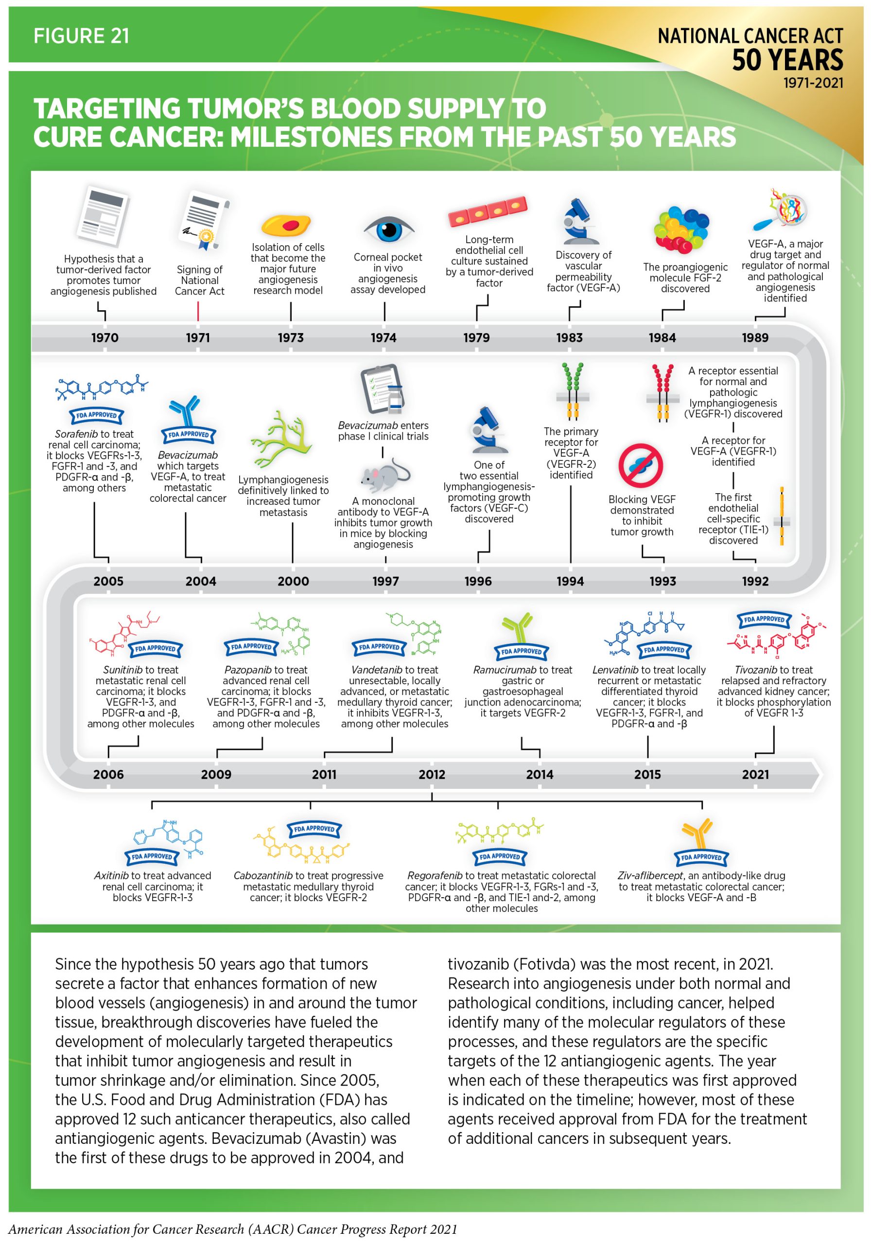 Angiogenesis is the formation of a network of blood vessels that supplies nutrients to newly formed tissues during normal development. In 1970, researchers first posited that tumors secrete factor(s) to drive blood vessel formation in and around the tumor, thus establishing a “supply chain” of nutrients for tumors to grow and spread (456)Sherwood LM, Parris EE, Folkman J. Tumor Angiogenesis: Therapeutic Implications. N Engl J Med. 1971;285(21).. Fifty years of discovery science since then have led to the identification of key molecules that are necessary for tumor angiogenesis. Researchers have leveraged this knowledge to develop molecules, sometimes called antiangiogenic drugs or angiogenesis inhibitors, that inhibit tumor angiogenesis (Figure 21)(457)Lugano R, Ramachandran M, Dimberg A. Tumor angiogenesis: causes, consequences, challenges and opportunities. Cell Mol Life Sci. 2020;77(9).. Clinical breakthroughs stemming from this research are highlighted by the development and FDA approval of 12 angiogenic inhibitors—including tivozanib (Fotivda) approved in March 2021—to treat a wide range of solid tumors.