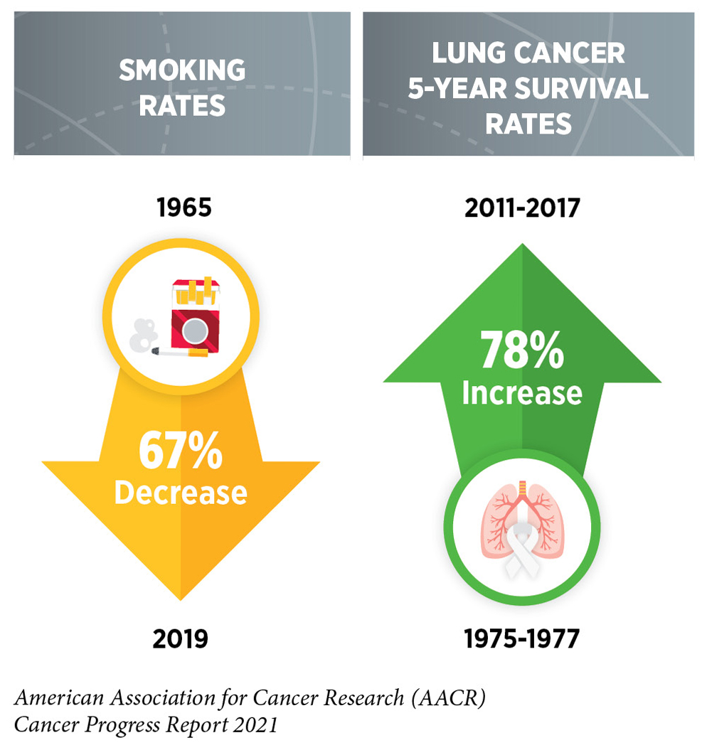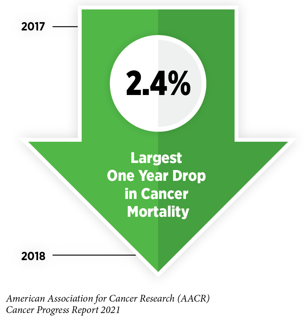 Research is the backbone of progress against cancer because it spurs the development of novel and better approaches to preventing, detecting, diagnosing, treating, and curing many of the diseases we call cancer. These advances are driving down overall U.S. cancer incidence and death rates and increasing the number of individuals who are surviving longer after a cancer diagnosis. For example, the age-adjusted overall U.S. cancer death rate declined by 31 percent from 1991 to 2018, which is the last year for which these data are available. Rapid declines in the death rates from aggressive tumors, such as lung cancer and melanoma, over the last decade have contributed significantly to this reduction in overall cancer deaths. In addition, the U.S. 5-year relative survival rate for all cancers combined has increased from 49 percent for people diagnosed in the mid-1970s to 68 percent for those diagnosed from 2011 to 2017.