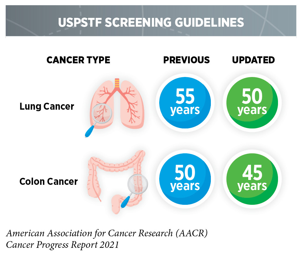 Determining whether broad implementation of a cancer screening test across a defined population can decrease deaths from the screened cancer and provide benefits that outweigh the potential risks of undergoing the test requires extensive research and careful analysis of the data generated. Currently, there are five types of cancer—breast, cervical, colorectal, lung, and prostate cancer—for which screening tests have been used to monitor large segments of the U.S. population. During the 12 months covered in this report, U.S. Preventive Services Task Force (USPSTF), an independent volunteer panel of experts in prevention and evidence-based medicine, updated their guidelines for colorectal and lung cancer screening by expanding the age-based eligibility to a broader population.