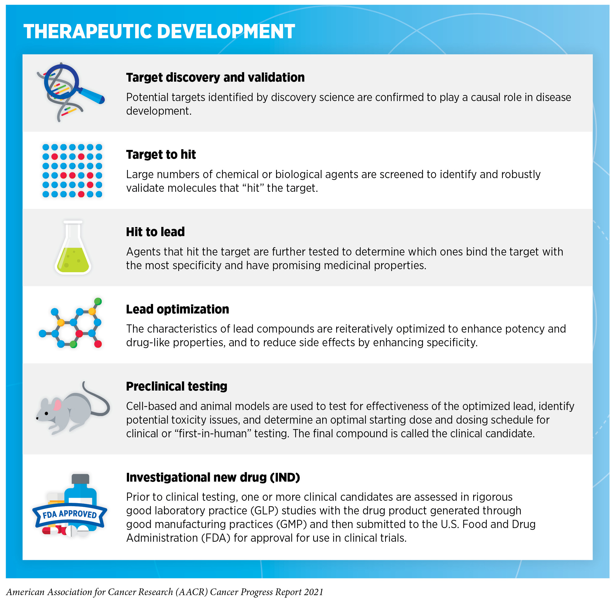 Researchers are harnessing the power of AI in different ways to accelerate drug discovery for many diseases including cancer (614)Ho D. Artificial intelligence in cancer therapy. Science (80- ). 2020;367(6481).(615)Sahoo D, Swanson L, Sayed IM, et al. Artificial intelligence guided discovery of a barrier-protective therapy in inflammatory bowel disease. Nat Commun. 2021;12(1).(616)Savage N. Tapping into the drug discovery potential of AI. Biopharma Deal. Published online 2021.. Some efforts are aimed at accelerating the pace of basic research such as identifying new targets, while others are designed to make clinical trials more efficient. The use of AI can potentially improve each step of the drug development process (see sidebar on Therapeutic Development). For instance, AI can harness massive amounts of information from the scientific literature, clinical databases, and patient-derived data to identify potential new drug targets, such as proteins that are vital for cancer growth; to design new therapeutics that target such proteins; and to help evaluate the safety and effectiveness of those therapeutics (617)J V, D C, P C, et al. Applications of machine learning in drug discovery and development. Nat Rev Drug Discov. 2019;18(6):463-477..