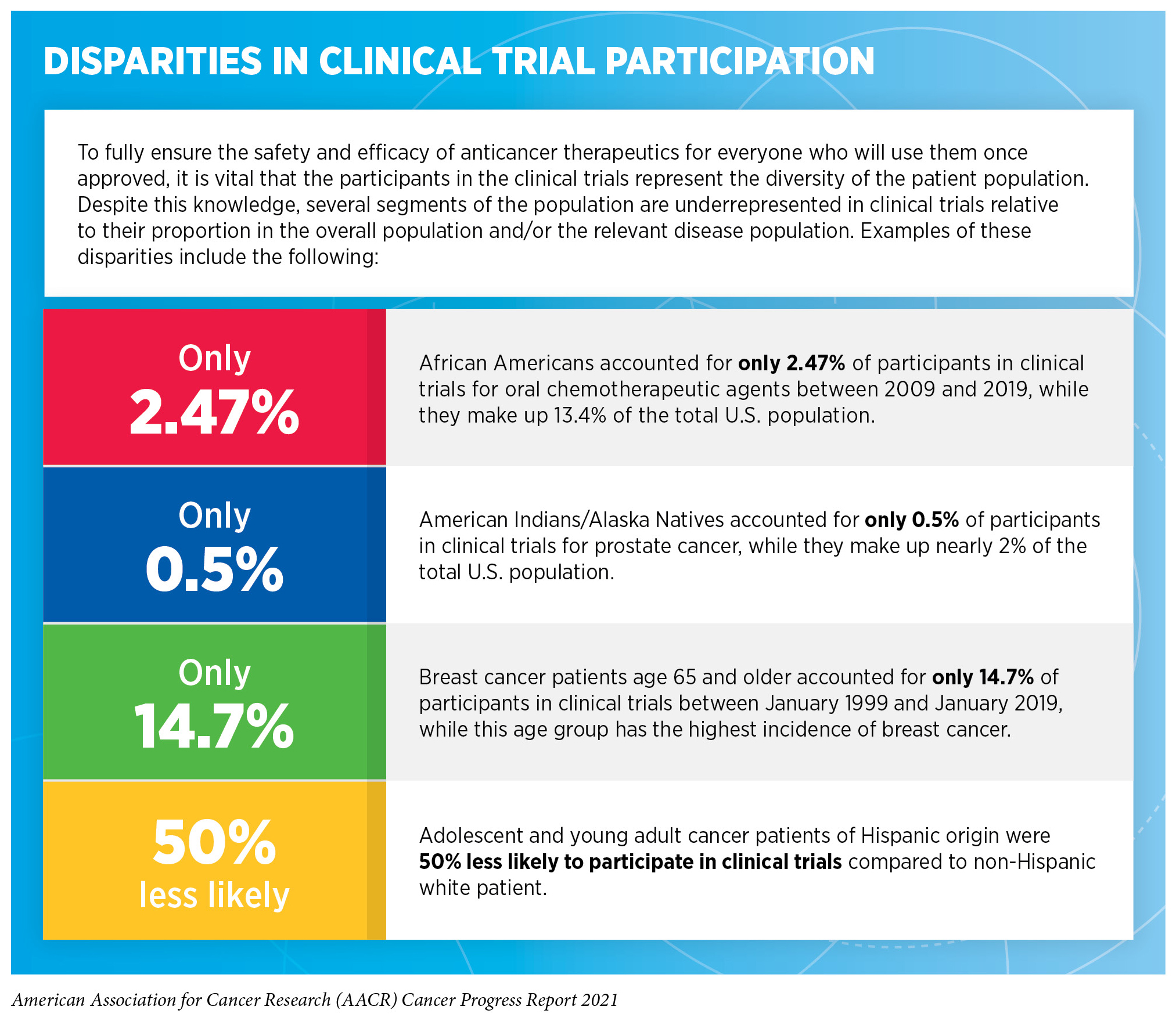 One of the most pressing challenges in drug development is low patient participation in clinical trials, especially for racial and ethnic minorities and other underserved populations (see sidebar on Disparities in Cancer Clinical Trial Participation). Overcoming barriers to clinical trial participation is a major focus for all stakeholders in the cancer research community. Data from recent studies indicate that AI platforms can play a critical role in these efforts. A known barrier for minority patients’ participation in clinical trials is restrictive and sometimes poorly justified eligibility criteria for patient inclusion. A new report, which used an AI platform to harness data from electronic health records from more than 60,000 lung cancer patients and publicly available trial eligibility criteria from clinicaltrials.gov to evaluate the real-world impact of eligibility criteria on patient recruitment and outcomes, found that many patients who were excluded from certain trials due to the restrictive criteria could have benefited from treatments provided in the trials (625)Liu R, Rizzo S, Whipple S, et al. Evaluating eligibility criteria of oncology trials using real-world data and AI. 2021;592(7855):629-633.. In fact, when the researchers broadened the eligibility criteria using the AI-guided approach, the estimated number of eligible patients more than doubled. Notably, the study also found that trials with broader eligibility did not have any more adverse event-related treatment withdrawals compared to trials with strict eligibility criteria. AI-driven methodologies such as the one used in this study can be critical in the future design of more inclusive clinical trials while still maintaining patient safety.