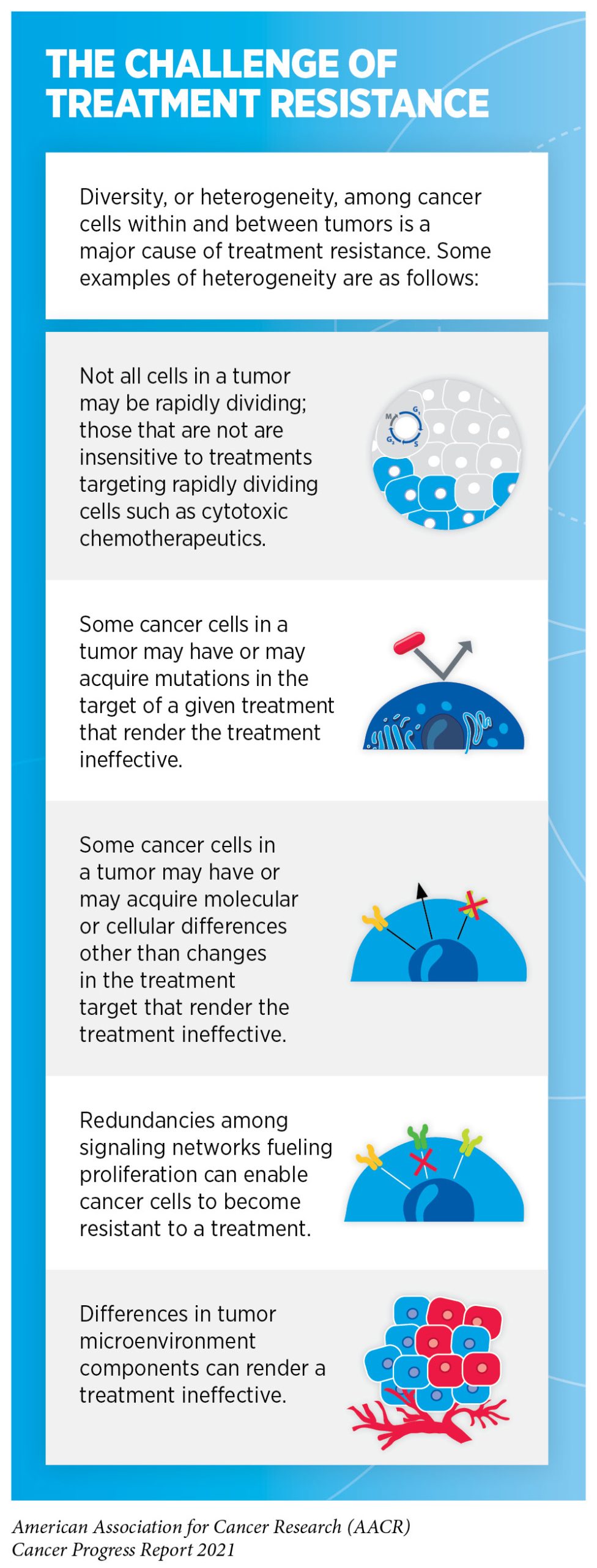 Because of their unique mechanism of action, PROTACs have certain advantages over traditional cancer treatment using small molecule inhibitors or antibodies (e.g., most molecularly targeted therapeutics or immunotherapeutics) which work by physically binding to cellular proteins in tumors and blocking their function. An ongoing challenge in treatment with molecularly targeted therapeutics or immunotherapeutics is the development of treatment resistance (see sidebar on The Challenge of Treatment Resistance). Common mechanisms by which cancer cells become resistant to therapeutics are by increasing the levels of target proteins or by gaining new mutations in the target proteins. Since PROTACs work by destroying rather than inhibiting target proteins, treatment with PROTACs can overcome these pathways of treatment resistance. Another advantage with this type of therapeutics approach is that PROTACs are recycled after they degrade their target proteins. Therefore, one molecule of PROTAC can eradicate multiple copies of the target protein. Thus, a smaller dose of PROTACs compared to small molecule inhibitors might be as effective in producing a desired antitumor effect. Furthermore, since PROTACs do not need to bind to the active sites of target proteins, they can be easier to design against otherwise intractable targets.