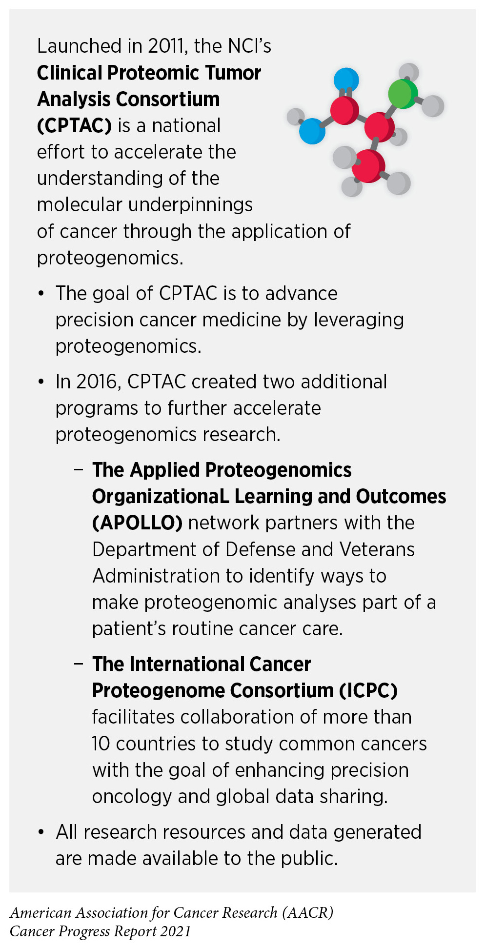 According to NCI, proteogenomics is defined as the study of how information about the DNA in a cell or organism relates to the proteins made by that cell or organism. This includes understanding when proteins get made and what modifications occur to proteins after they are made that may switch them on or off. Ongoing research on cancer proteogenomics, much of which is led by the NCI’s Clinical Proteomic Tumor Analysis Consortium (CPTAC), is aimed at uncovering novel insights into the cellular and molecular basis of cancer development and identifying potential new therapeutic interventions that cannot be obtained through genomics alone (605)Rodriguez H, Zenklusen JC, Staudt LM, Doroshow JH, Lowy DR. The next horizon in precision oncology: Proteogenomics to inform cancer diagnosis and treatment. Cell. 2021;184(7):1661-1670.(606)Chen YJ, Roumeliotis TI, Chang YH, et al. Proteogenomics of Non-smoking Lung Cancer in East Asia Delineates Molecular Signatures of Pathogenesis and Progression. Cell. 2020;182(1).(607)Krug K, Jaehnig EJ, Satpathy S, et al. Proteogenomic Landscape of Breast Cancer Tumorigenesis and Targeted Therapy. Cell. 2020;183(5).(608)Petralia F, Tignor N, Reva B, et al. Integrated Proteogenomic Characterization across Major Histological Types of Pediatric Brain Cancer. Cell. 2020;183(7).(609)Huang C, Chen L, Savage SR, et al. Proteogenomic insights into the biology and treatment of HPV-negative head and neck squamous cell carcinoma. Cancer Cell. 2021;39(3).(610)Satpathy S, Krug K, Beltran PMJ, et al. A proteogenomic portrait of lung squamous cell carcinoma. Cell. 2021;184(16):4348-4371.e40..