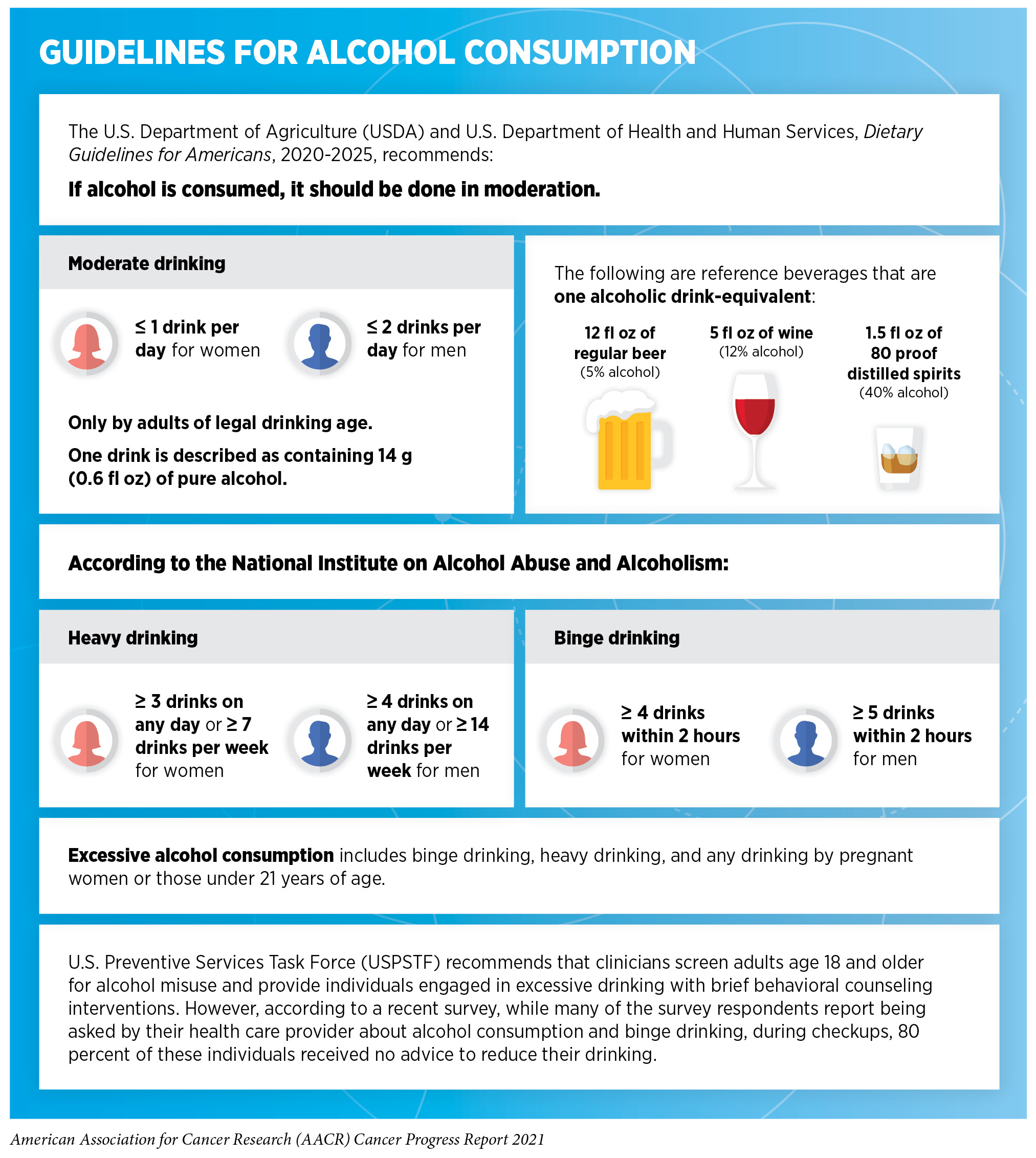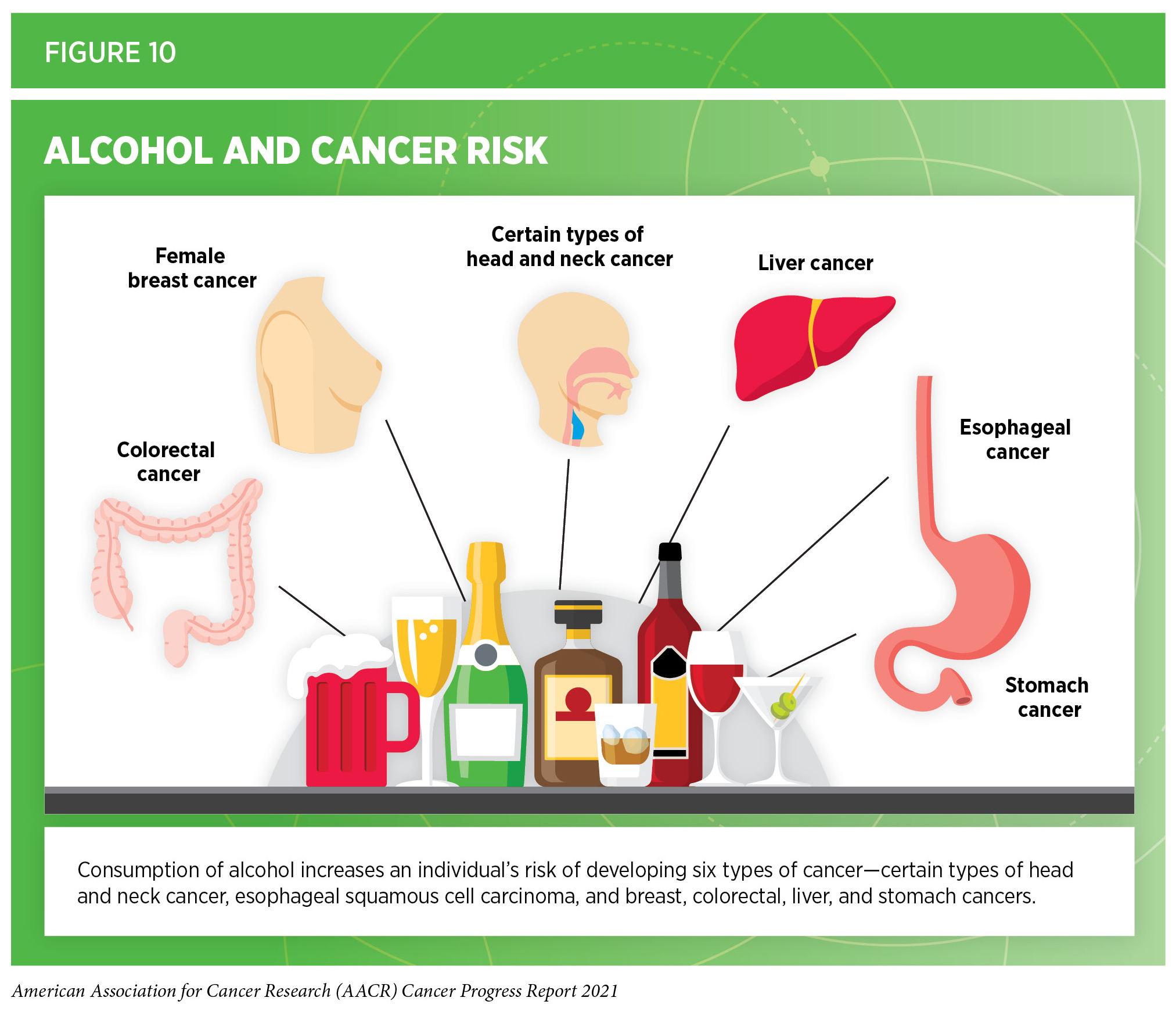 Beyond the United States, alcohol poses a significant public health challenge globally. In fact, alcohol-use disorders are now the most prevalent of all substance-use disorders worldwide (290)The global burden of disease attributable to alcohol and drug use in 195 countries and territories, 1990-2016: a systematic analysis for the Global Burden of Disease Study 2016. The lancet Psychiatry. 2018;5(12):987-1012., and in 2020, 4.1 percent of all new cases of cancer globally were attributed to alcohol consumption (291)Rumgay H, Shield K, Charvat H, et al. Global burden of cancer in 2020 attributable to alcohol consumption: a population-based study. Lancet Oncol. 2021;22(8):1071-1080.. These data underscore the importance of adhering to comprehensive guidelines to limit alcohol intake (for those who drink) and minimize the risk of developing a disease or dying due to alcohol. Future efforts focused on public education and evidence-based policy interventions, such as regulating alcohol retail density, taxes, and prices, need to be implemented along with effective clinical strategies to reduce the burden of alcohol-related cancers. In this regard, recent studies from Canada indicate that when alcohol bottles contain labels providing drinking guidelines, as well as, clear information on the risks of alcohol consumption, people are better informed about alcohol’s adverse effects and may limit their drinking (292)E H, A W, K V, et al. Testing Alcohol Labels as a Tool to Communicate Cancer Risk to Drinkers: A Real-World Quasi-Experimental Study. J Stud Alcohol Drugs. 2020;81(2):249-261.. Ongoing efforts are underway to implement similar policies requiring cancer-specific warning labels to be displayed on all alcoholic beverages in the United States (293)DEPARTMENT OF THE TREASURY ALCOHOL AND TOBACCO TAX AND TRADE. Published online 2020..