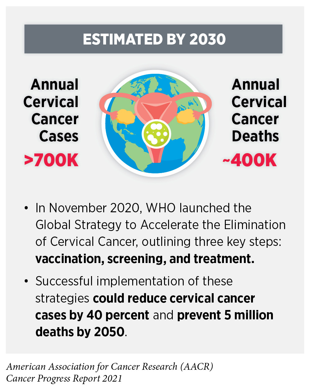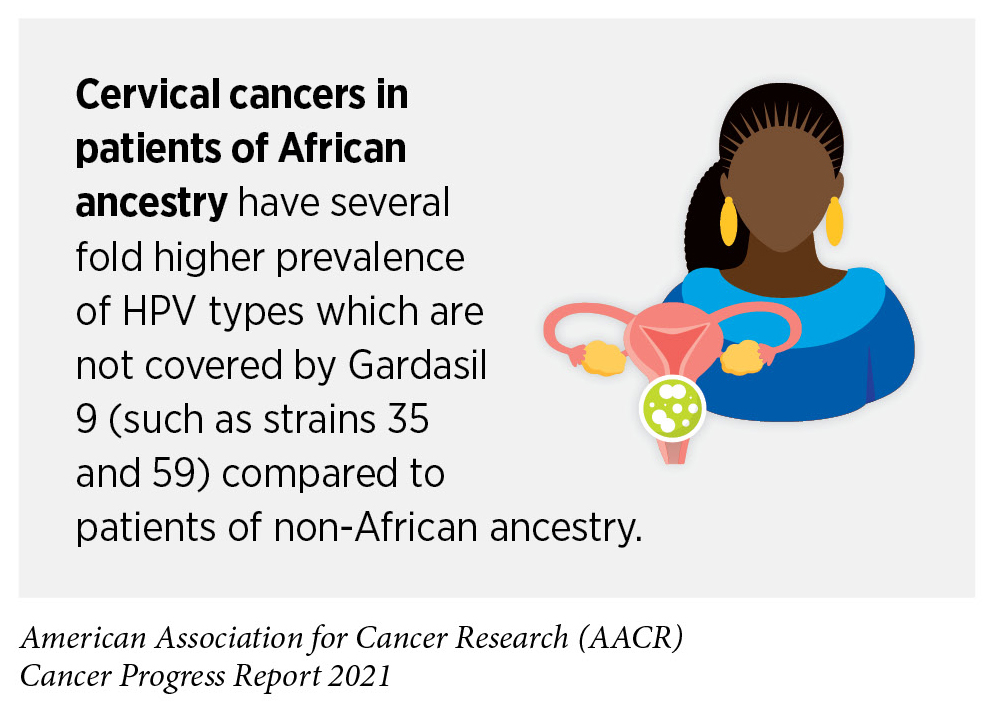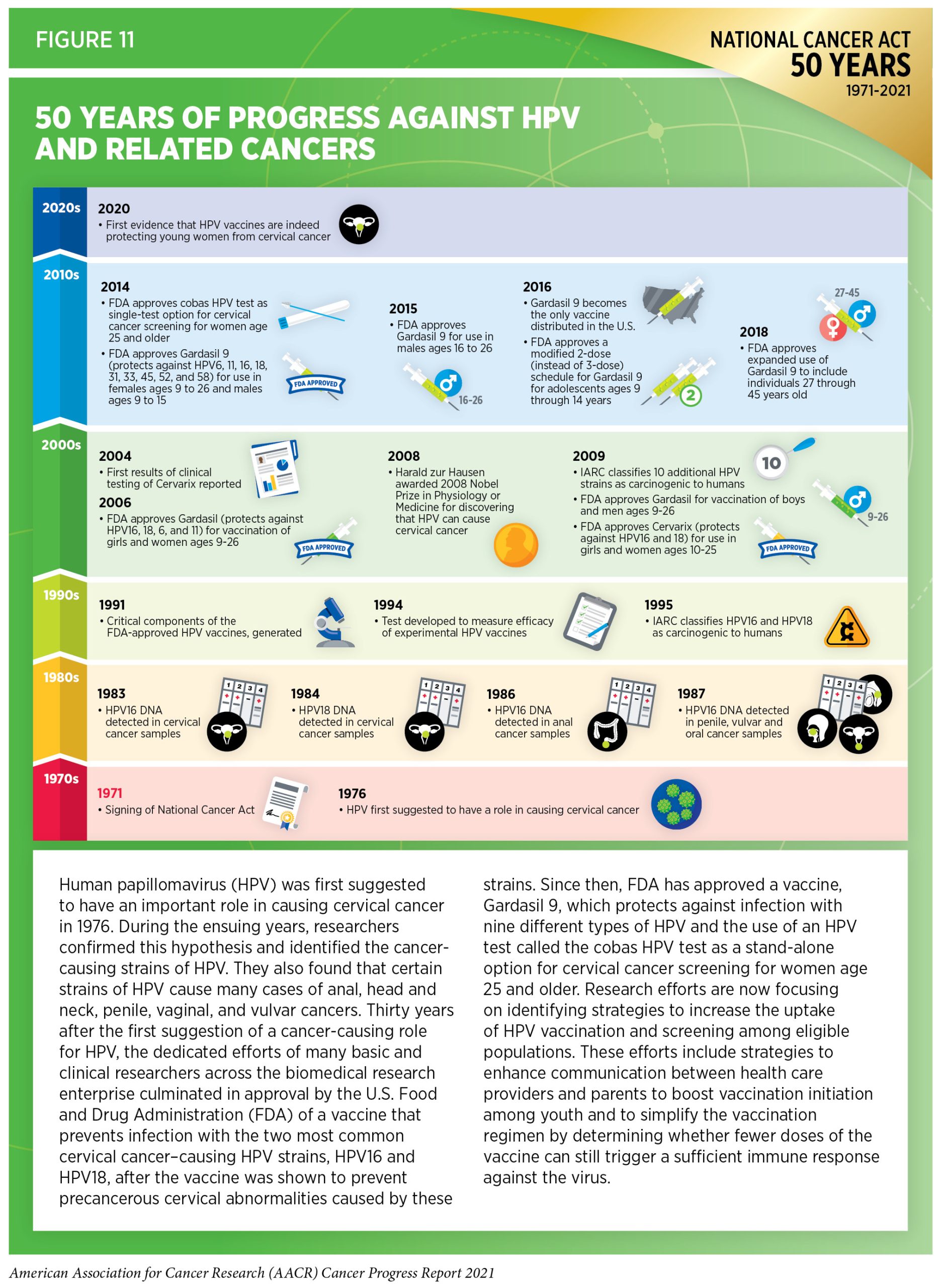 Persistent infection with HPV is responsible for almost all cervical cancers, 90 percent of anal cancers, about 70 percent of oropharyngeal cancers, and more than half of all vaginal, vulvar, and penile cancers (307)Centers for Disease Control and Prevention. HPV and cancer: cancers associated with human papillomavirus (HPV).. This knowledge has driven the development of vaccines that prevent infection with some cancer-causing strains of HPV and the development of a clinical test that detects cancer-causing HPV strains in cervical cells (see Figure 11). There are 13 different types of HPV that can cause cancers; the HPV vaccine currently used in the United States, Gardasil 9, can protect against nine of these HPV strains (307)Centers for Disease Control and Prevention. HPV and cancer: cancers associated with human papillomavirus (HPV).. There is emerging evidence confirming that the receipt of guideline-concordant HPV vaccination significantly lowers the risk of infection with HPV types that are covered by the vaccines and dramatically reduces the incidence of cervical cancers among the vaccinated (308)Rosenblum HG, Lewis RM, Gargano JW, Querec TD, Unger ER, Markowitz LE. Declines in Prevalence of Human Papillomavirus Vaccine-Type Infection Among Females after Introduction of Vaccine — United States, 2003–2018. MMWR Surveill Summ. 2021;70(12).(309)Lei J, Ploner A, Elfström KM, et al. HPV Vaccination and the Risk of Invasive Cervical Cancer. 2020;383(14):1340-1348.(310)Mix JM, van Dyne EA, Saraiya M, Hallowell BD, Thomas CC. Assessing impact of HPV vaccination on cervical cancer incidence among women aged 15–29 years in the United States, 1999–2017: An ecologic study. Cancer Epidemiol Biomarkers Prev. 2021;30(1).. According to a recent analysis of data from nearly 1.7 million women from Sweden, HPV vaccination before the age of 17 years was shown to lower the risk of cervical cancer incidence by nearly 90 percent (309)Lei J, Ploner A, Elfström KM, et al. HPV Vaccination and the Risk of Invasive Cervical Cancer. 2020;383(14):1340-1348.. Unfortunately, the uptake of HPV vaccines has been suboptimal in the United States. Even though there has been some progress in the uptake of vaccines in recent years, only 56 percent of boys and 61 percent of girls who are eligible were up to date on their vaccination regimen in 2020 (311)Pingali C. National, Regional, State, and Selected Local Area Vaccination Coverage Among Adolescents Aged 13–17 Years — United States, 2020. MMWR Morb Mortal Wkly Rep. 2021;70(35):1183-1190..