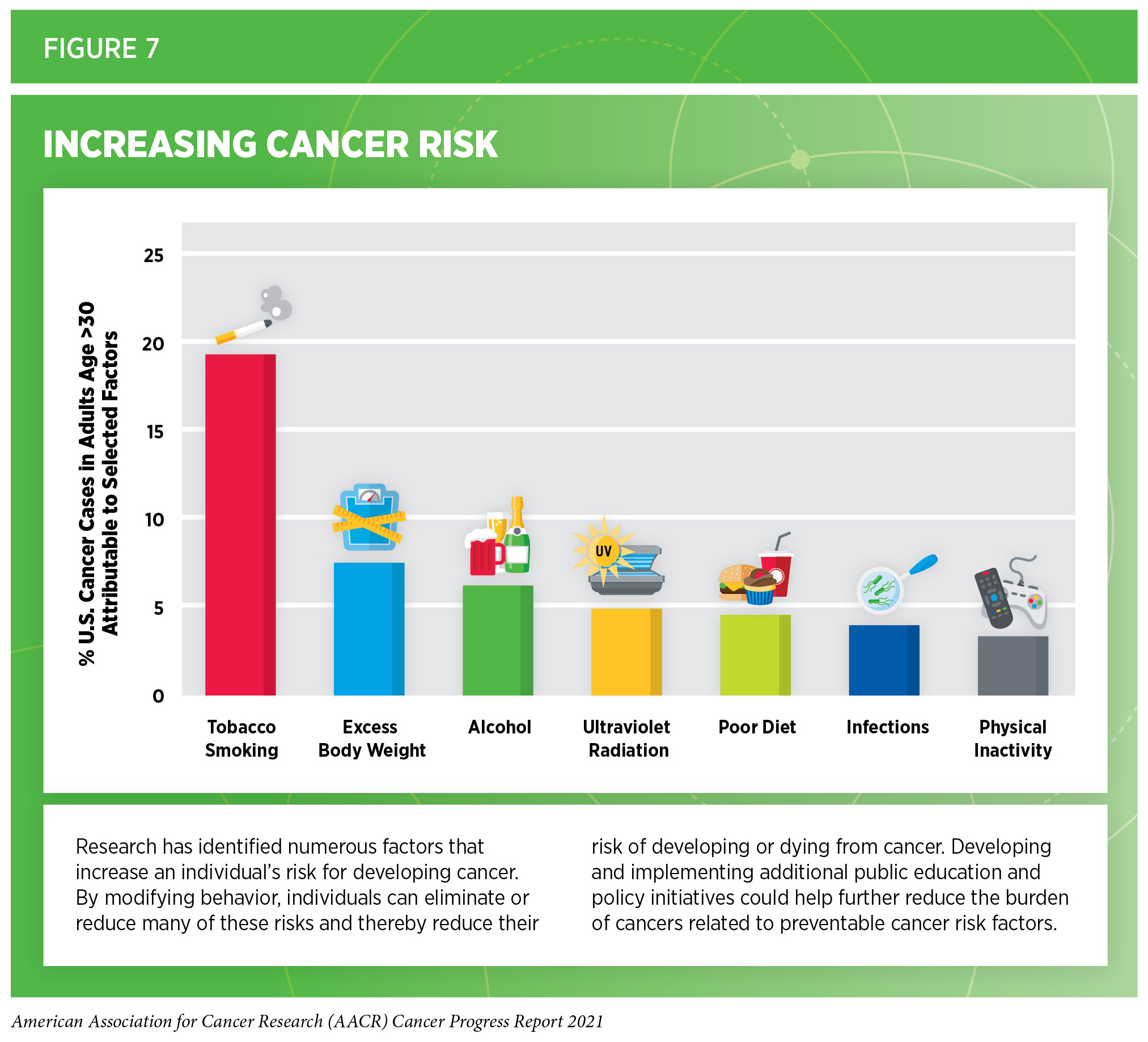 Factors that increase a person’s chances of developing cancer are referred to as cancer risk factors. Decades of research have led to the identification of numerous cancer risk factors (see Figure 7) such as tobacco use, poor diet, physical inactivity, obesity, infection with certain pathogens, and exposure to ultraviolet (UV) radiation. Given that several of these risks can be avoided, many cases of cancer could potentially be prevented. In fact, according to a recent report, healthy lifestyle habits can reduce risks even among those with a higher genetic risk for cancer (see sidebar on How Do I Know If I Am at High Risk for Developing an Inherited Cancer?)(180)Zhu M, Wang T, Huang Y, et al. Genetic Risk for Overall Cancer and the Benefit of Adherence to a Healthy Lifestyle. Cancer Res. Published online 2021.. In the United States, more than 40 percent of all new cancer cases diagnosed in 2014, which are the most recent data available, were attributable to preventable risk factors (181)Islami F, Goding Sauer A, Miller KD, et al. Proportion and number of cancer cases and deaths attributable to potentially modifiable risk factors in the United States. 2018;68(1):31-54.. Emerging data indicate that certain cancer risk factors are also associated with worse outcomes after a cancer diagnosis including development of secondary cancers (182)Sung H, Hyun N, Leach CR, Yabroff KR, Jemal A. Association of first primary cancer with risk of subsequent primary cancer among survivors of adult-onset cancers in the United States. JAMA – J Am Med Assoc. 2020;324(24).(183)Petrelli F, Cortellini A, Indini A, et al. Association of Obesity With Survival Outcomes in Patients With Cancer. JAMA Netw Open. 2021;4(3)..