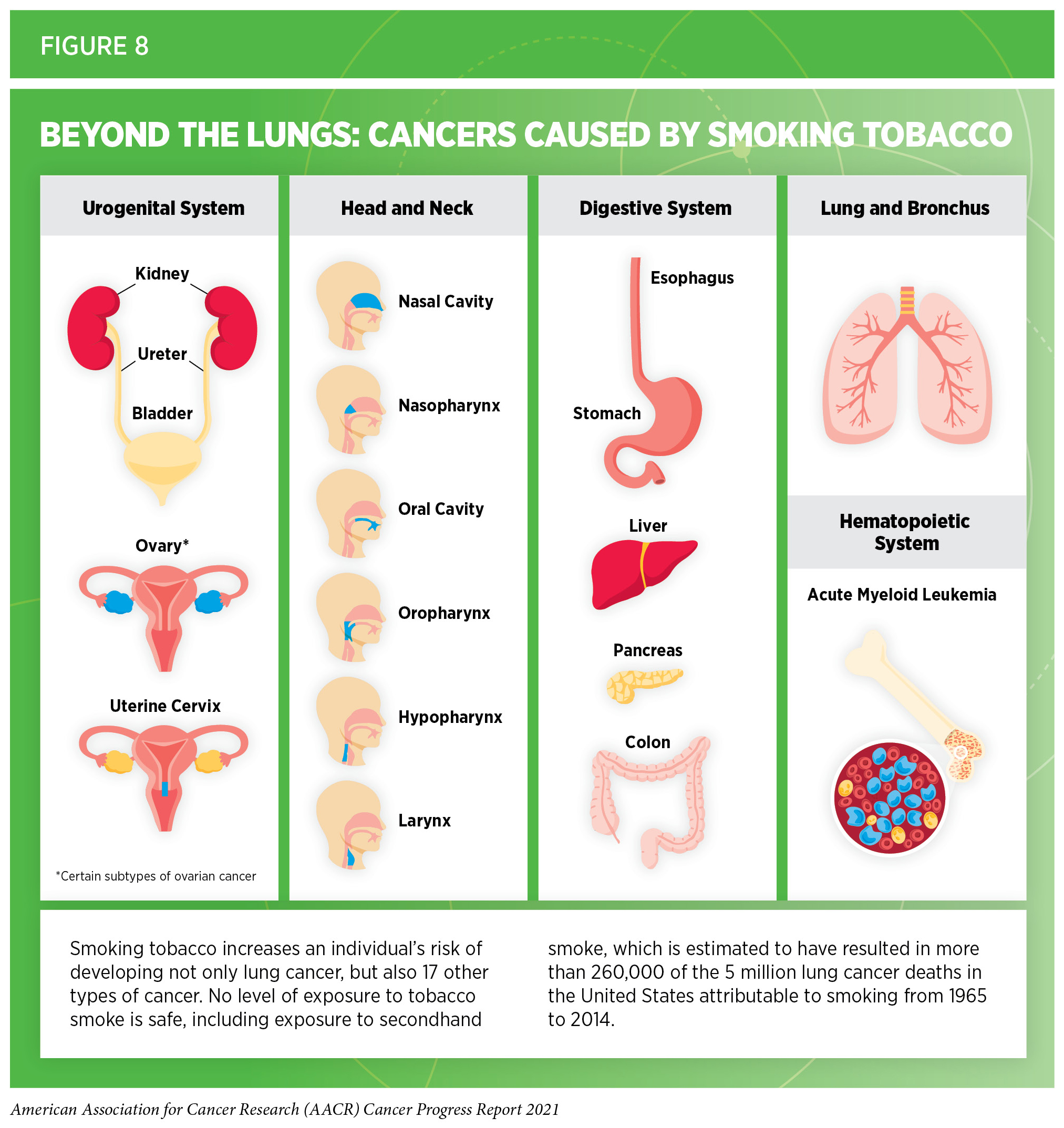 Use of tobacco is the leading cause of preventable disease, disability, and death in the United States, taking more than 480,000 lives each year (196)American Lung Association. State of tobacco control 2021. [cited 2021 Jul 10].. Smoking tobacco has been shown to increase the risk of developing 17 different types of cancer in addition to lung cancer (see Figure 8). Smokers are exposed to numerous harmful chemicals that damage DNA, causing genetic and epigenetic alterations that lead to cancer development (197)Centers for Disease Control and Prevention. Cancer and tobacco use. CDC Vital Signs, November 2016.(198)M V, SY H, I K, et al. Chronic Cigarette Smoke-Induced Epigenomic Changes Precede Sensitization of Bronchial Epithelial Cells to Single-Step Transformation by KRAS Mutations. Cancer Cell. 2017;32(3):360-376.e6.(199)TM B, H K, R T, et al. Smoking is associated with hypermethylation of the APC 1A promoter in colorectal cancer: the ColoCare Study. J Pathol. 2017;243(3):366-375.. Fortunately, quitting tobacco at any age can reduce risks from cancer as well as several other smoking-related adverse health effects, such as cardiovascular and pulmonary diseases (200)United States Public Health Services Office of the Surgeon General; National Center for Chronic Disease Prevention and Health Promotion (US) Office on Smoking and Health. Smoking cessation: a report of the Surgeon General. Washington (DC); US Department o.