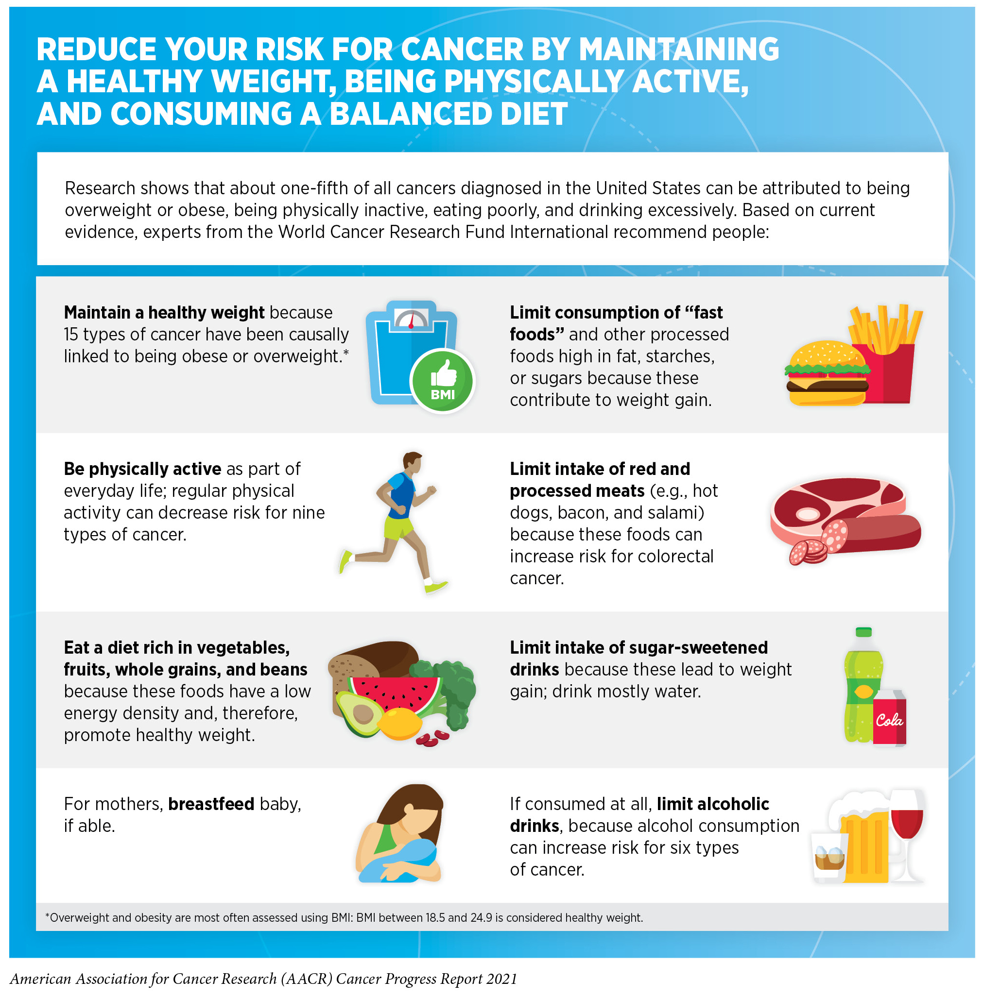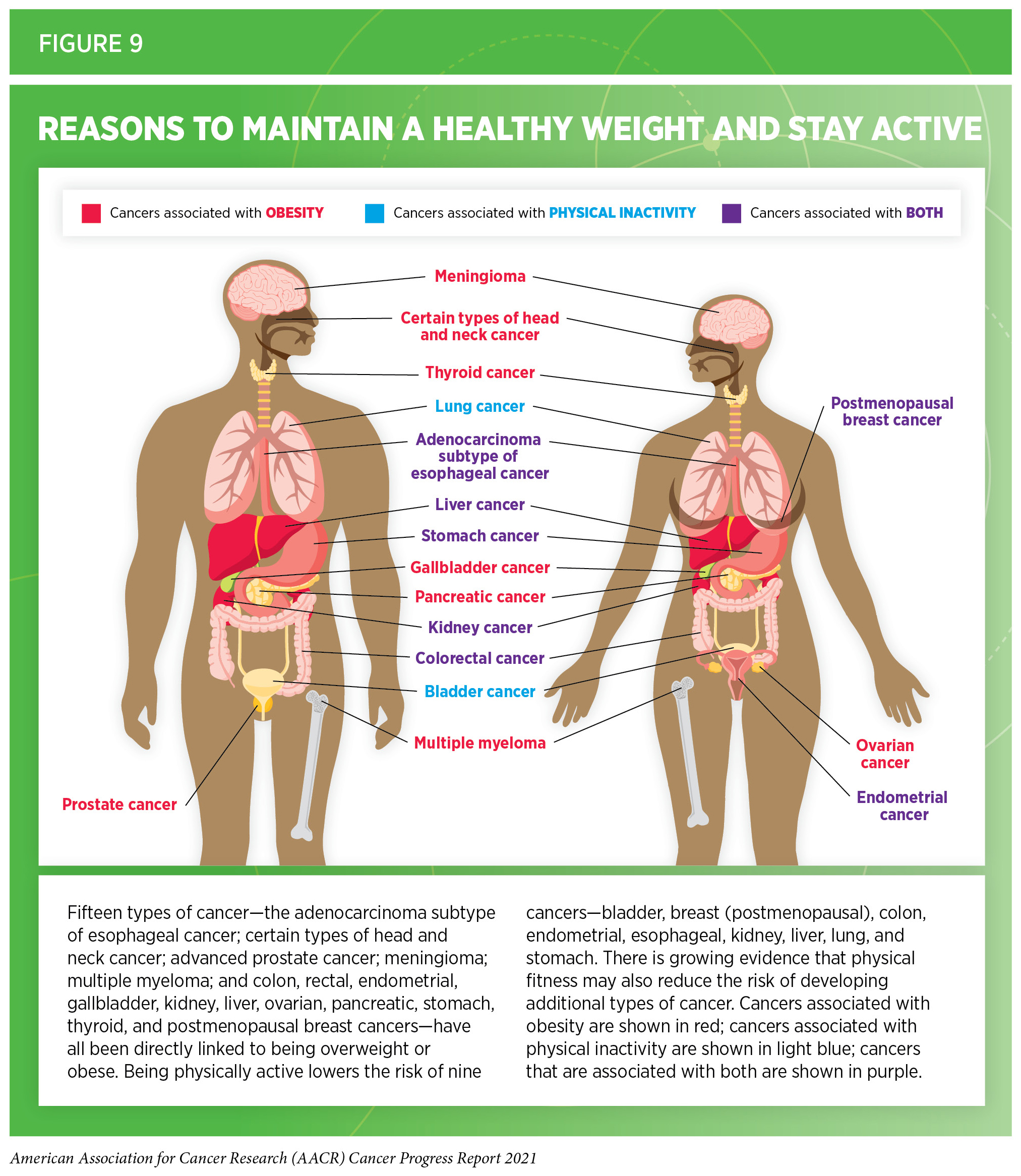 Nearly 20 percent of new cancer cases and 16 percent of cancer deaths in U.S. adults are attributable to a combination of excess body weight, poor diet, physical inactivity, and alcohol consumption (181)Islami F, Goding Sauer A, Miller KD, et al. Proportion and number of cancer cases and deaths attributable to potentially modifiable risk factors in the United States. 2018;68(1):31-54.. Being overweight or obese as an adult increases a person’s risk for 15 types of cancer; being physically active reduces risk for nine types of cancer (see Figure 9). Therefore, maintaining a healthy weight, being physically active, and consuming a balanced diet are effective ways a person can lower the risk of developing or dying from cancer (see sidebar on Reduce Your Risk for Cancer by Maintaining a Healthy Weight, Being Physically Active, and Consuming a Balanced Diet). Identifying the underlying mechanisms by which obesity, unhealthy diet, and physical inactivity increase cancer risk and quantifying the magnitude of such risks are areas of active research.