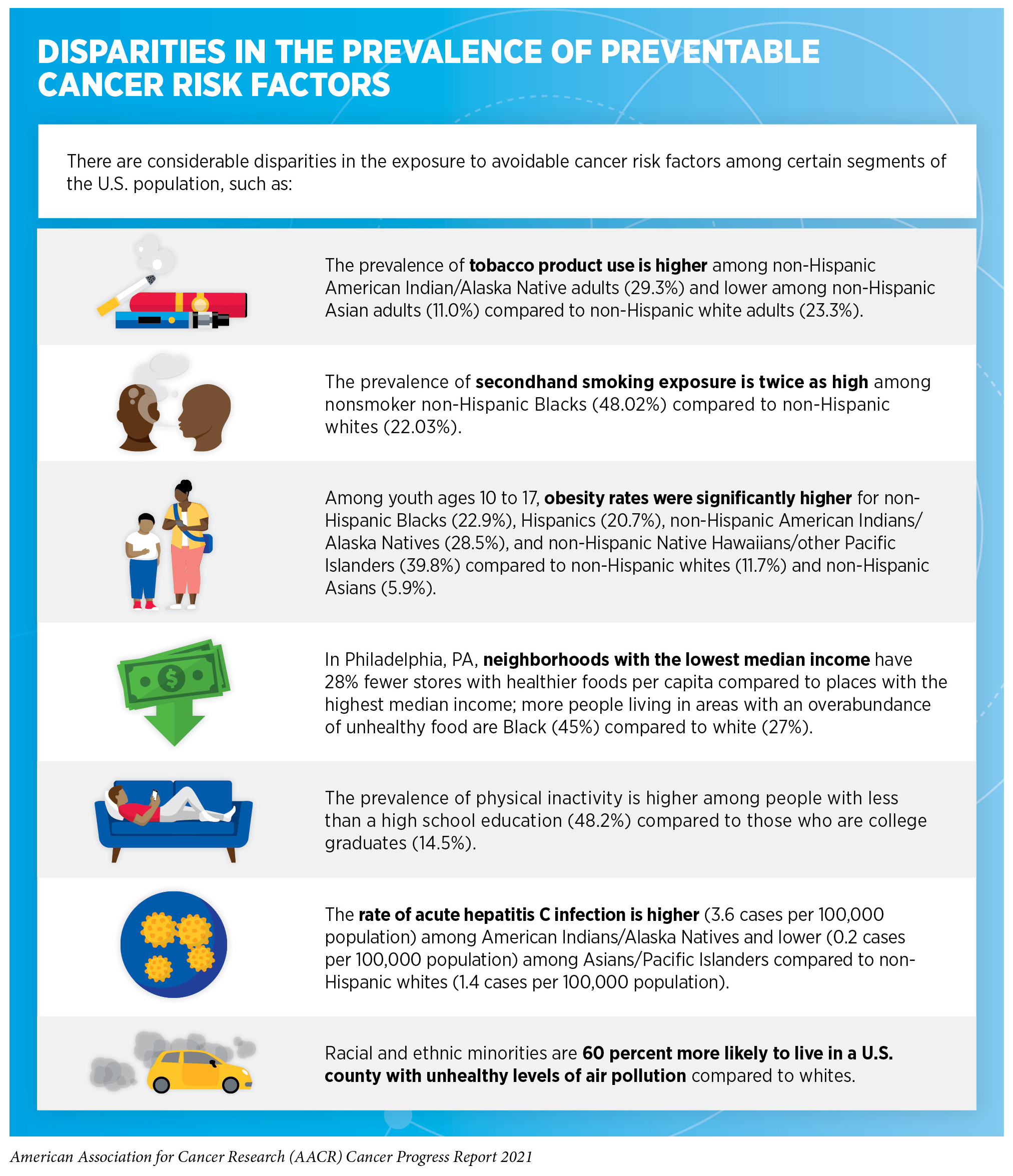 In the United States, many of the greatest reductions in cancer morbidity and mortality have been achieved through the implementation of effective public education and policy initiatives. For example, such initiatives have helped reduce cigarette smoking rates among U.S. adults by 67 percent from 1965 to 2019 (23)Cornelius ME, Wang TW, Jamal A, Loretan CG, Neff LJ. Tobacco Product Use Among Adults — United States, 2019. MMWR Morb Mortal Wkly Rep. Published online 2020.. These reductions have contributed significantly to the dramatic decline in overall U.S. cancer mortality rates (3)American Cancer Society. American Cancer Society: Cancer Facts and Figures 2021. Atlanta Am Cancer Soc. Published online 2021:13-15.. However, cigarette smoking still accounted for nearly four out of 10 cancer deaths in parts of the United States between 2013 and 2017 (185)Islami F, Bandi P, Sahar L, Ma J, Drope J, Jemal A. Cancer deaths attributable to cigarette smoking in 152 U.S. metropolitan or micropolitan statistical areas, 2013–2017. Cancer Causes Control. 2021;(0123456789):2013-2017.. It is also concerning that the prevalence of certain cancer risk factors, such as obesity has been rising steadily among U.S. adults (186)Trust for America’s Health. The state of obesity 2020: better policies for a healthier America. Robert Wood Johnson Foundation. 2020 Sept.(187)Sung H, Siegel RL, Rosenberg PS, Jemal A. Emerging cancer trends among young adults in the USA: analysis of a population-based cancer registry. Lancet Public Heal. 2019;4(3):e137-e147.(188)Koroukian SM, Dong W, Berger NA. Changes in Age Distribution of Obesity-Associated Cancers. JAMA Netw Open. 2019;2(8):e199261-e199261.. Consequently, progress in terms of mortality reduction has slowed down for obesity-related cancers compared to cancers not associated with obesity (189)Avery CL, Howard AG, Nichols HB. Comparison of 20-Year Obesity-Associated Cancer Mortality Trends with Heart Disease Mortality Trends in the US. JAMA Netw Open. Published online 2021.. There are, however, significant disparities in the burden of cancer risk factors among certain segments of the U.S. population such as racial and ethnic minorities and individuals from low socioeconomic status (see sidebar on Disparities in the Prevalence of Preventable Cancer Risk Factors). Therefore, it is imperative that all stakeholders come together to identify better strategies for the dissemination of our current knowledge of cancer prevention and implementation of effective evidence-based practices that promote a healthier lifestyle among all populations.