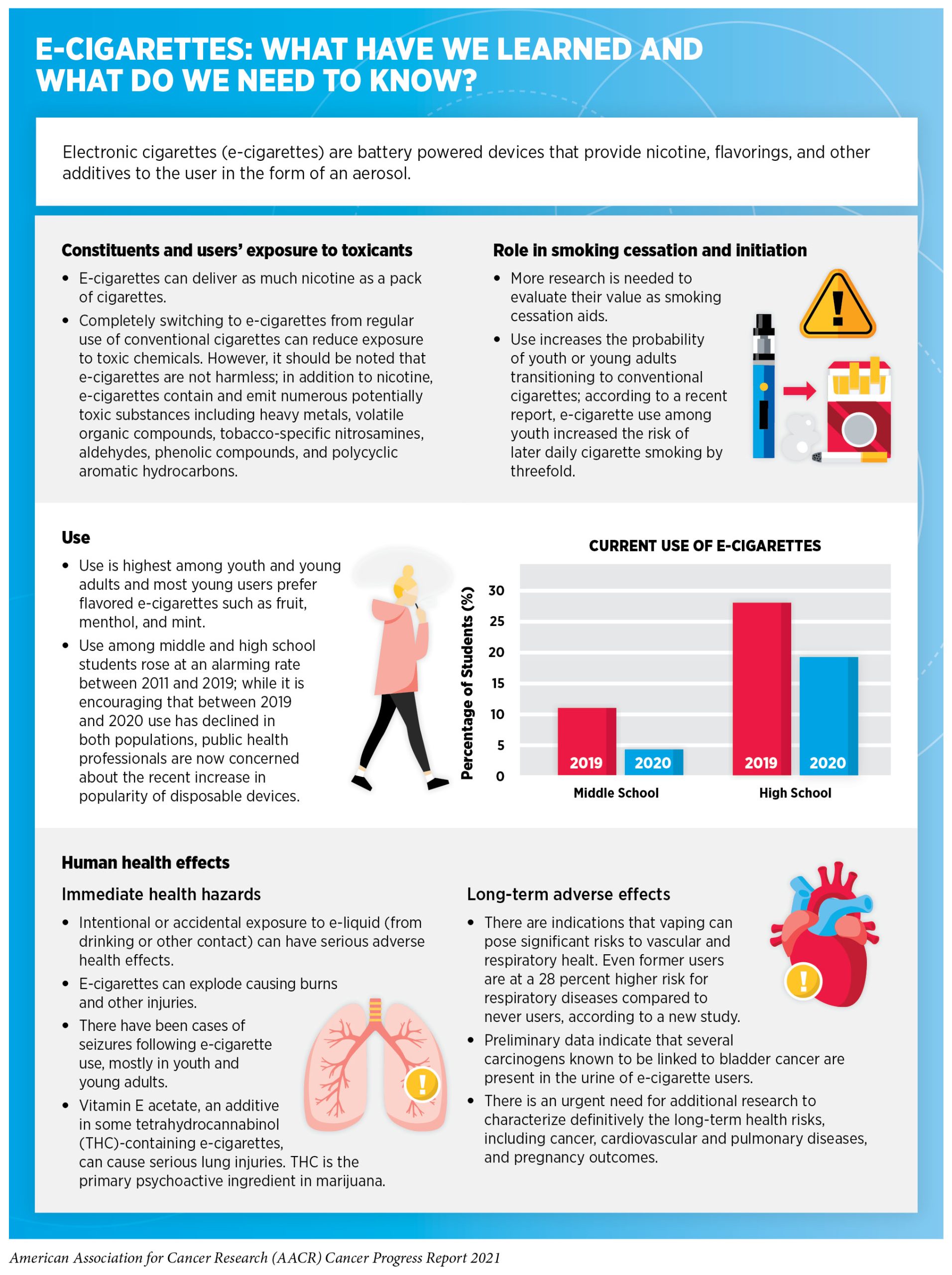 The use of other combustible tobacco products (for example, cigars), smokeless tobacco products (for example, chewing tobacco and snuff), and waterpipes (hookahs) is also associated with adverse health outcomes including cancer (211)CH C, B R, C C, et al. Association of Cigarette, Cigar, and Pipe Use With Mortality Risk in the US Population. JAMA Intern Med. 2018;178(4):469-476.. Electronic cigarettes (e-cigarettes) have gained enormous popularity among U.S. youth and young adults over the past decade (see sidebar on E-Cigarettes: What Have We Learned and What Do We Need to Know?). E-cigarettes, first introduced to the U.S. market in 2007, have been the most used tobacco product among U.S. middle and high school students since 2014 (202)Gentzke AS. Tobacco Product Use Among Middle and High School Students — United States, 2020. MMWR Morb Mortal Wkly Rep. 2020;69(50):1881-1888.(212)Surgeon General’s Advisory on E-cigarette Use Among Youth The E-cigarette Epidemic Among Youth.. Since their introduction to the U.S. marketplace, the landscape of e-cigarettes has evolved to include different types of products such as prefilled pods (cartridge–based devices) and disposable (single use) devices, among others. E-cigarettes come in flavors that appeal to youth, and these flavors are key drivers of use among youth and young adults. E-cigarettes deliver very high levels of nicotine, an extremely addictive substance, that is harmful to the developing brain (213)U.S. Department of Health and Human Services. E-cigarette use among youth and young adults. A report of the Surgeon General. Atlanta, GA: U.S. Department of Health and Human Services, Centers for Disease Control and Prevention, National Center for Chronic Disease Prevention and Health Promotion, Office on Smoking and Health, 2016., and are known to contain high levels of other toxic chemicals including reactive aldehydes (214)Public Health Consequences of E-Cigarettes. Public Heal Consequences E-Cigarettes. Published online 2018..