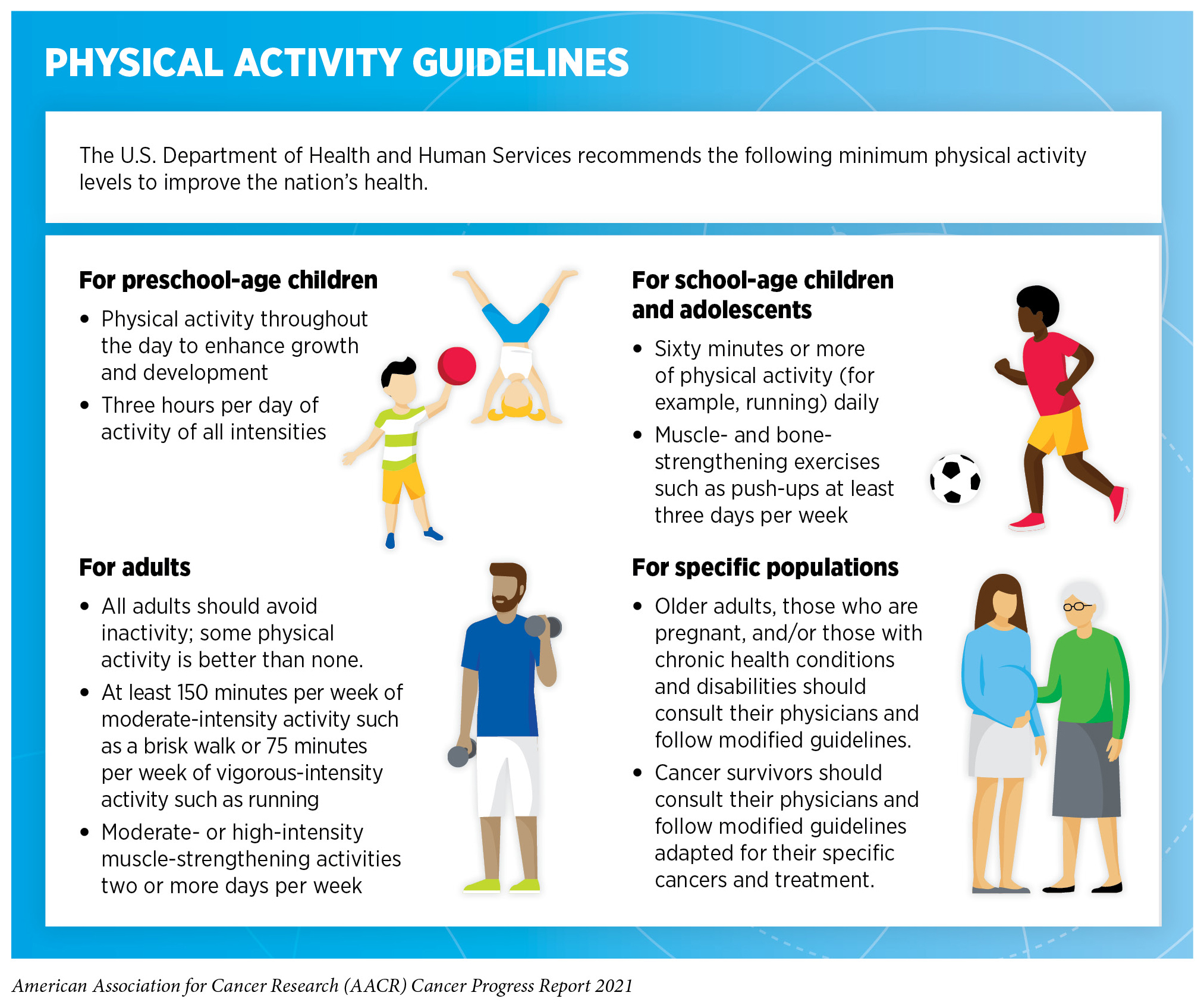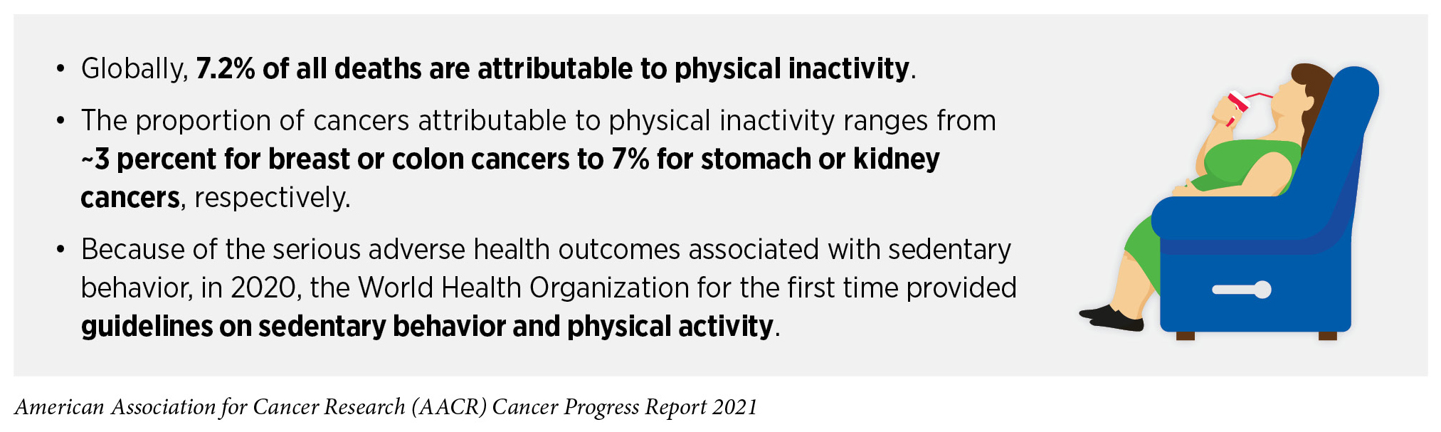 Three percent of overall cancer cases in the United States can be attributed to physical inactivity (181)Islami F, Goding Sauer A, Miller KD, et al. Proportion and number of cancer cases and deaths attributable to potentially modifiable risk factors in the United States. 2018;68(1):31-54.. According to a recent report, being sedentary (inactive) for 13 or more hours per day can increase the risk of dying from cancer by 52 percent while replacing 30 minutes of sedentary time with 30 minutes of moderate to high intensity physical activity can lower risk of cancer death by 30 percent (272)SC G, VJ H, T A, et al. Association of Sedentary Behavior With Cancer Mortality in Middle-aged and Older US Adults. JAMA Oncol. 2020;6(8):1210-1217.. Engaging in recommended amounts of physical activity (see sidebar on Physical Activity Guidelines) can lower the risks for developing nine types of cancer (Figure 9), and there is emerging evidence that there may be risk reduction for even more cancer types (238)CE M, SC M, H A, et al. Amount and Intensity of Leisure-Time Physical Activity and Lower Cancer Risk. J Clin Oncol. 2020;38(7):686-698.(239)AV P, CM F, SC M, et al. American College of Sports Medicine Roundtable Report on Physical Activity, Sedentary Behavior, and Cancer Prevention and Control. Med Sci Sports Exerc. 2019;51(11):2391-2402.(240)Moore SC, Lee I-M, Weiderpass E, et al. Association of Leisure-Time Physical Activity With Risk of 26 Types of Cancer in 1.44 Million Adults. JAMA Intern Med. 2016;176(6):816-825.. Considering this evidence, it is concerning that more than a quarter of U.S. adults reported no leisure time physical activity in 2018, and about 17 percent of U.S. high school students reported no physical activity in 2019 (262)American Cancer Society. Cancer prevention & early detection: facts & figures 2021-2022. Atlanta: American Cancer Society: 2021.(273)American Cancer Society. Cancer prevention & early detection facts & figures 2019-2020. Atlanta: American Cancer Society; 2019.. There are added concerns that the COVID-19 pandemic may have led to further decreases in physical activity and increases in sedentary behavior across several population groups (274)Stockwell S, Trott M, Tully M, et al. Changes in physical activity and sedentary behaviours from before to during the COVID-19 pandemic lockdown: A systematic review. BMJ Open Sport Exerc Med. 2021;7(1).. It is imperative that health care professionals and policy makers work together to increase awareness of the benefits of physical activity and support efforts to implement programs and policies to facilitate a physically active lifestyle for everyone.
