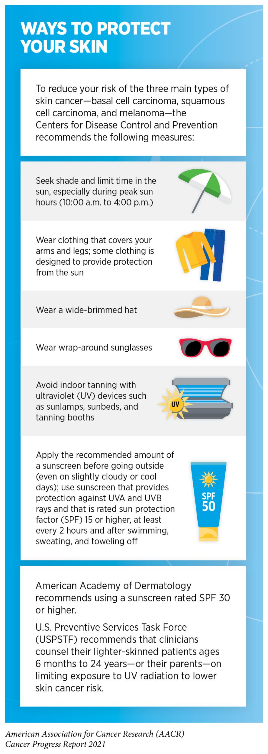 Three main types of skin cancer—basal cell carcinoma, squamous cell carcinoma, and melanoma which is the deadliest form of skin cancer—are largely caused by exposure to UV radiation from the sun or indoor tanning devices. In the United States, an estimated 91 percent of the total cases of melanoma during 2011–2015 could be attributed to UV exposure (294)F I, AG S, KD M, et al. Cutaneous melanomas attributable to ultraviolet radiation exposure by state. Int J cancer. 2020;147(5):1385-1390.. Sunburn, a clear indication of excessive exposure to UV radiation, is a preventable risk factor for skin cancer, and those events occurring in childhood pose the greatest risk (295)LK D, MJ V, LE BF, BJ S, DV D, JA C. Sunburns and risk of cutaneous melanoma: does age matter? A comprehensive meta-analysis. Ann Epidemiol. 2008;18(8):614-627.. Therefore, one of the most effective ways a person can reduce his or her risk of skin cancer is by practicing sun-safe habits and not using UV indoor tanning devices (see sidebar on Ways to Protect Your Skin).