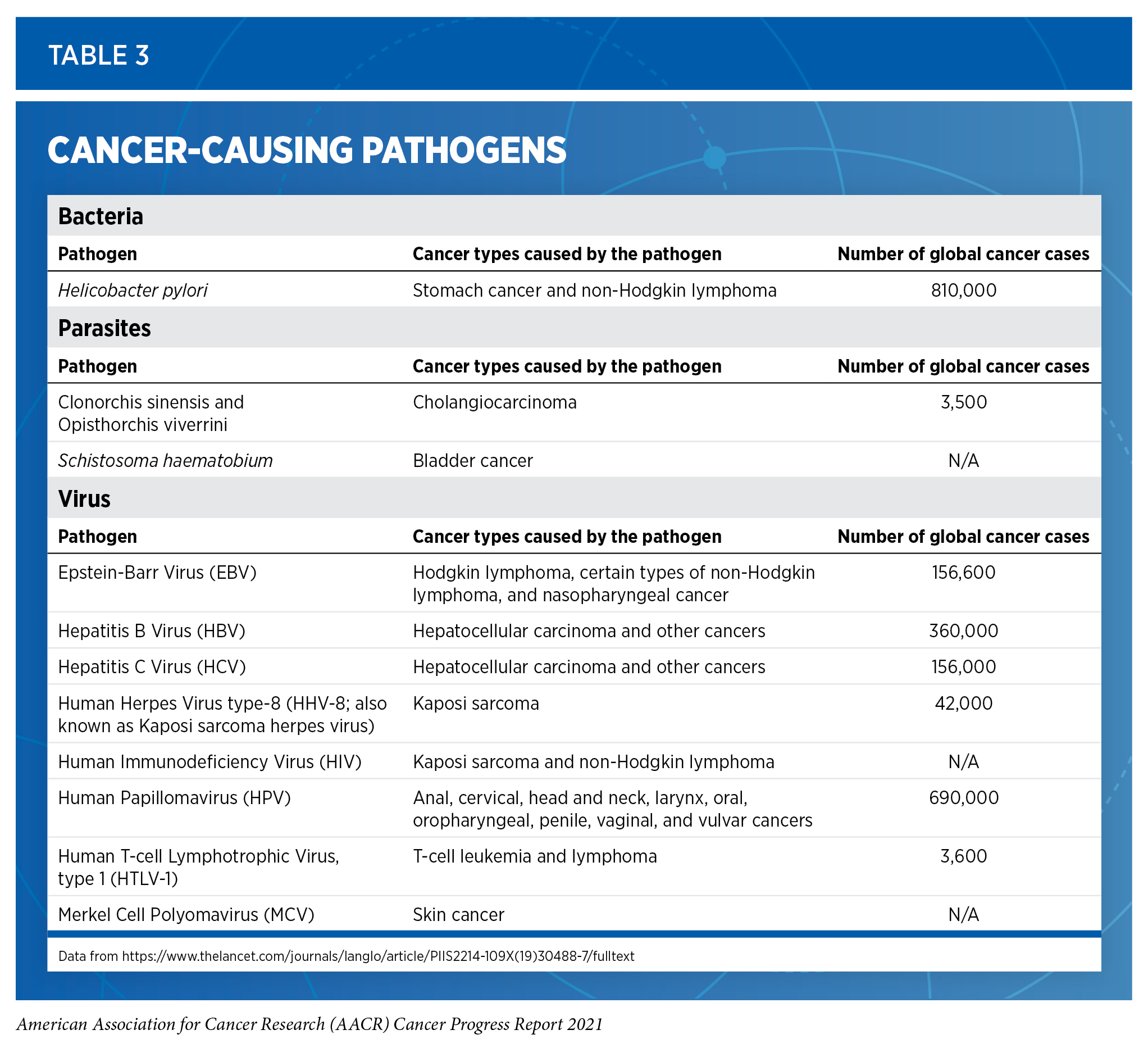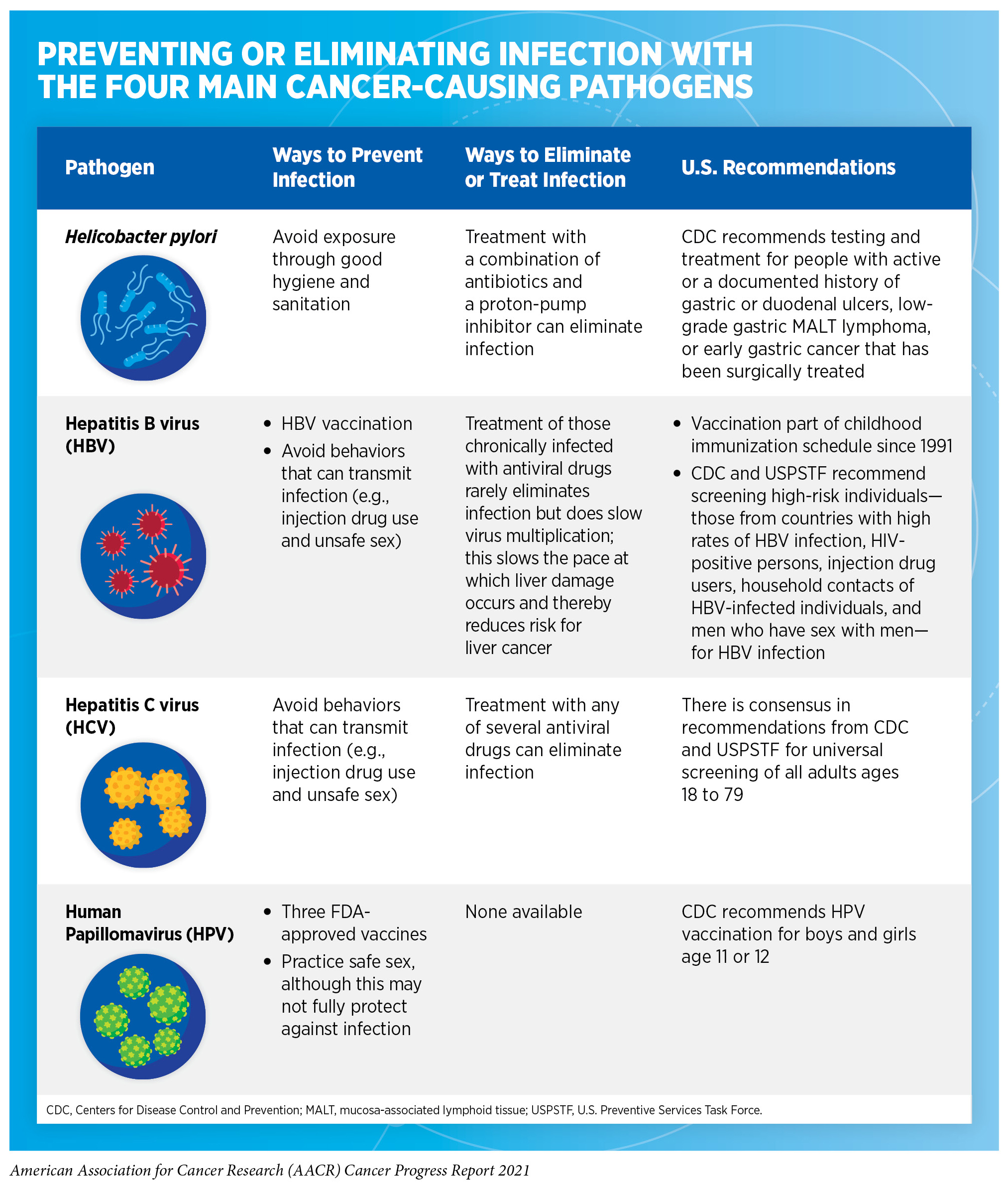 Persistent infection with several pathogens—bacteria, viruses, and parasites that cause disease—increases a person’s risk for several types of cancer (see Table 3). Globally, an estimated 13 percent of all cancer cases in 2018 were attributable to infection, with more than 90 percent of these cases attributable to just four pathogens: human papillomavirus (HPV), hepatitis B virus (HBV), hepatitis C virus (HCV), and Helicobacter pylori (300)de Martel C, Georges D, Bray F, et al. Global burden of cancer attributable to infections in 2018: a worldwide incidence analysis. Lancet Glob Heal. 2020;8(2):e180-e190.(301)CY H, DH S, D K, et al. Incidence of extrahepatic cancers among individuals with chronic hepatitis B or C virus infection: A nationwide cohort study. J Viral Hepat. 2020;27(9):896-903.. In the United States, about 3 percent of all cancer cases are attributable to infection with pathogens (181)Islami F, Goding Sauer A, Miller KD, et al. Proportion and number of cancer cases and deaths attributable to potentially modifiable risk factors in the United States. 2018;68(1):31-54.. Individuals can significantly lower their risks by protecting themselves from infection or by obtaining treatment, if available, to eliminate an infection (see sidebar on Preventing or Eliminating Infection with the Four Main Cancer-causing Pathogens). It is important to note that even though strategies to eliminate, treat, or prevent infection with Helicobacter pylori, HBV, HCV, and HPV can significantly lower an individual’s risks for developing cancers, these strategies are not effective at treating infection-related cancers once they develop.
