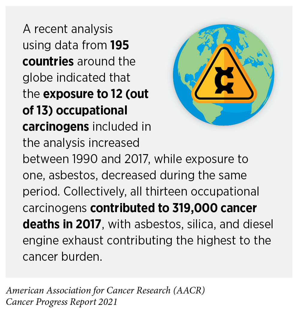 Involuntary exposures to many of the environmental pollutants are usually higher in subgroups of the population, such as workers in certain industries who may be exposed to carcinogens on the job, racial and ethnic minorities, or individuals living in low-income neighborhoods. Similarly, there are disparities in the burden of cancers caused by environmental exposures based on geographic locations and socioeconomic status (337)Baurick T, Younes L, Meiners J. Welcome to “cancer alley,” where toxic air is about to get worse. ProPublica 2019 Oct 30. Available from:. https://www.propublica.org/article/welcome-to-cancer-alley-where-toxic-air-is-about-to-get-worse. As we learn more about environmental and occupational cancer risk factors and identify those segments of the U.S. population who are exposed to these factors, new and/or more effective policies need to be developed and implemented for the benefit of all populations, especially the most vulnerable and underserved.