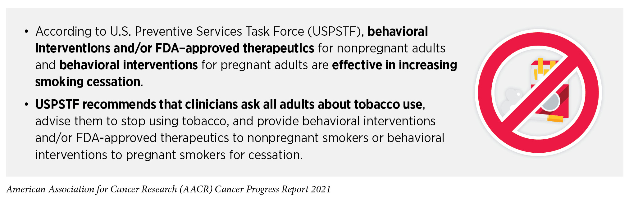 It is imperative that researchers, public health experts, and policy makers work together to identify evidence-based, population-level interventions such as tobacco price increases, public health campaigns, age and marketing restrictions, cessation counseling and medications, and smoke-free laws to further reduce smoking rates and smoking-related cancer burden in the United States. Effective interventions should also help drive down secondhand smoke exposure which is a risk factor for lung cancer among adult nonsmokers. Recent reports indicate that innovative interventions such as smoking cessation advice along with free samples of nicotine replacement therapy offered to expectant fathers or a smartphone application-based therapy offered to parents while they are visiting the office of their child’s pediatrician can increase smoking cessation (206)Drouin O, Sato R, Drehmer JE, et al. Cost-effectiveness of a Smoking Cessation Intervention for Parents in Pediatric Primary Care. JAMA Netw Open. 2021;4(4).(207)Luk TT, Lam TH, Leung WC, et al. Brief Advice, Nicotine Replacement Therapy Sampling, and Active Referral for Expectant Fathers Who Smoke Cigarettes: A Randomized Clinical Trial. JAMA Intern Med. Published online 2021.(208)E N-B, JE D, B HW, et al. Treating Parents for Tobacco Use in the Pediatric Setting: The Clinical Effort Against Secondhand Smoke Exposure Cluster Randomized Clinical Trial. JAMA Pediatr. 2019;173(10):931-939.. Ongoing research in this area is essential since over half of adult smokers try to quit smoking each year but fewer than 10 percent are successful (200)United States Public Health Services Office of the Surgeon General; National Center for Chronic Disease Prevention and Health Promotion (US) Office on Smoking and Health. Smoking cessation: a report of the Surgeon General. Washington (DC); US Department o. Notably, FDA-approved therapeutics and behavioral counseling have both been shown to improve the chances of quitting smoking and using them together can double the odds of quitting successfully (200)United States Public Health Services Office of the Surgeon General; National Center for Chronic Disease Prevention and Health Promotion (US) Office on Smoking and Health. Smoking cessation: a report of the Surgeon General. Washington (DC); US Department o.