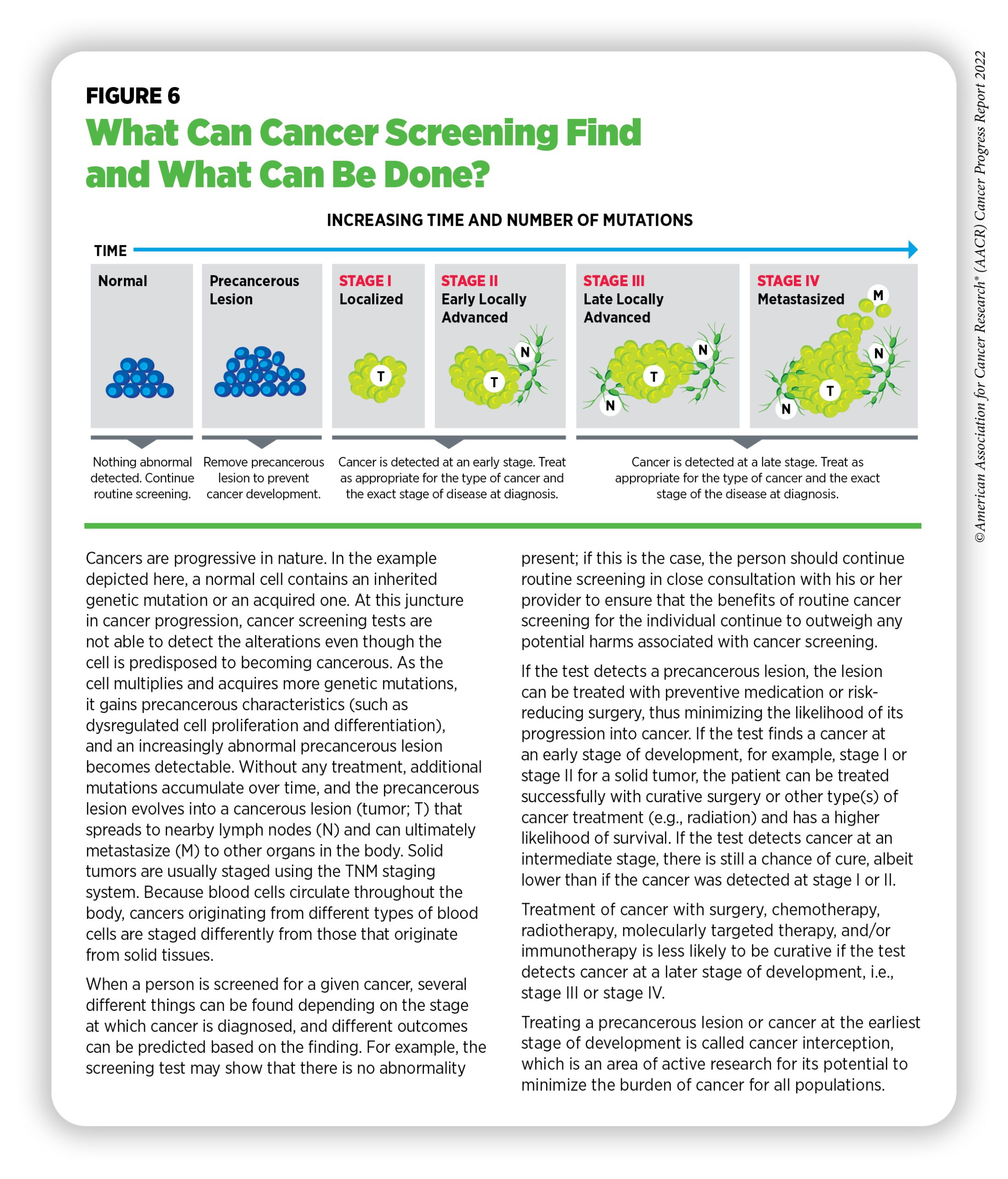 Cancer screening is the evidence-based determination of whether a person has precancerous lesions or cancer before any signs or symptoms of the disease appear. While modifying certain behaviors can reduce the risk of developing cancer, routine screening for cancer can help find an aberration at the earliest possible time during cancer development. Health care providers use the information gleaned from a cancer screening test to make an informed decision on whether to monitor or treat, or surgically remove precancerous lesions or early-stage cancer before either progresses to a more advanced stage (see Figure 6).