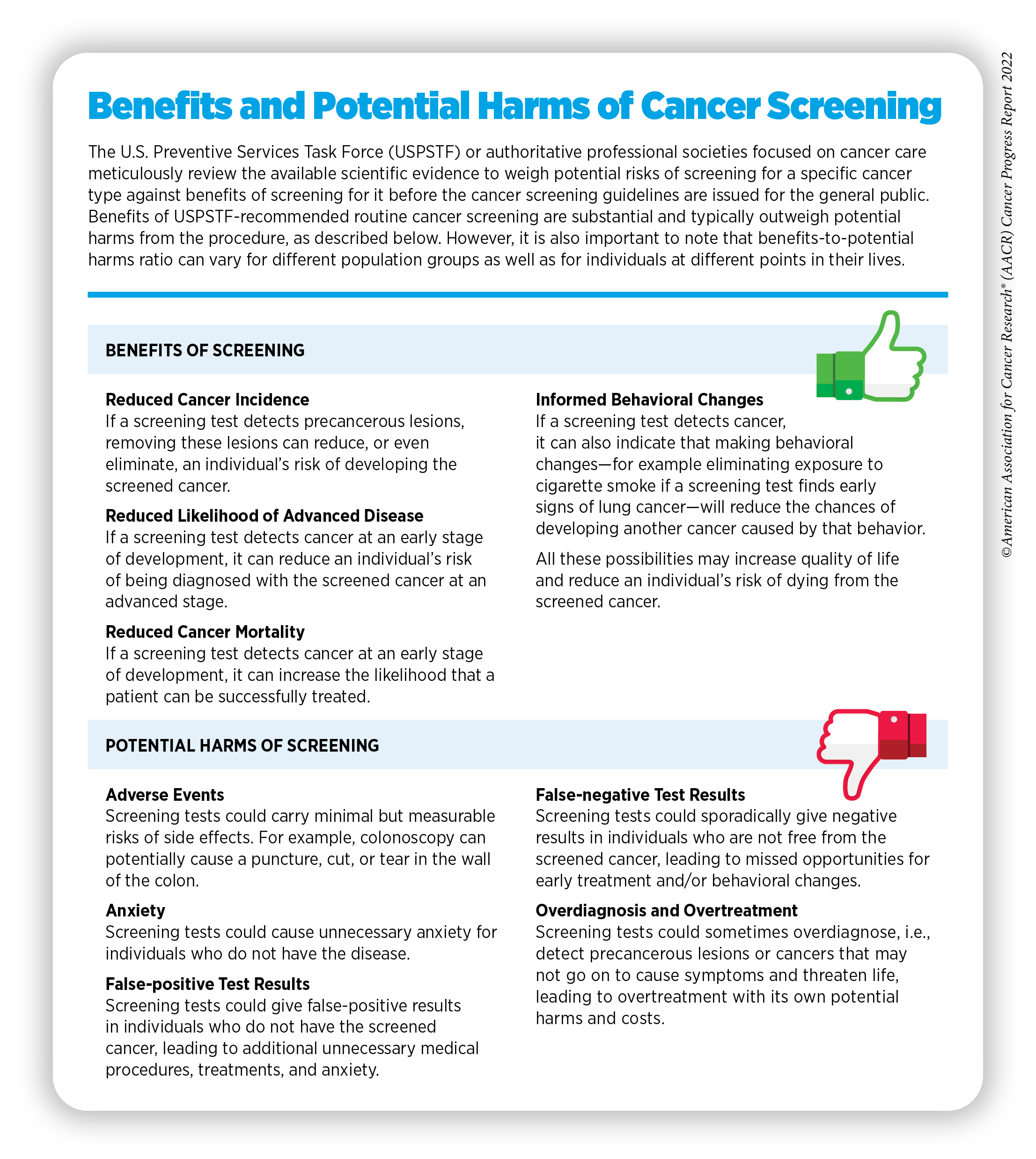 Detection of cancers through routine screening saves lives and improves quality of life by catching the disease early and treating it, and minimizing the risk of cancer progressing to an advanced, harder-to-treat stage (247)Crosby D, et al. Early detection of cancer. Science 2022;375:eaay9040. [LINK NOT AVAILABLE]. In 2020, findings from a landmark clinical trial evaluating the benefits of lung cancer screening showed a 25 percent decline in lung cancer deaths at a 10-year follow-up of more than 6,000 participants who underwent lung cancer screening from December 2003 to July 2006 (248)de Koning HJ, et al. Reduced Lung-Cancer Mortality with Volume CT Screening in a Randomized Trial. N Engl J Med 2020;382:503-13. [LINK NOT AVAILABLE]. A recent study examined the impact of lung cancer screening guidelines issued in 2013 by the U.S. Preventive Services Task Force (USPSTF) and compared it with that of the 2021 revised guidelines. According to the study’s findings, an estimated 6,845 and 23,444 additional lives would be saved from lung cancer if 30 percent and 100 percent of the population eligible under the revised guidelines were screened, respectively (249)Meza R, et al. Impact of Joint Lung Cancer Screening and Cessation Interventions Under the New Recommendations of the U.S. Preventive Services Task Force. J Thorac Oncol 2022;17:160-6. [LINK NOT AVAILABLE]. Another recent study found that increasing the current levels of screening for breast, colorectal and cervical cancers to 100 percent will collectively save more than 45,000 lives (250)Sharma KP, et al. Preventing Breast, Cervical, and Colorectal Cancer Deaths: Assessing the Impact of Increased Screening. Prev Chronic Dis 2020;17:E123. [LINK NOT AVAILABLE]. However, it is important to note that some screening tests are invasive medical procedures that can potentially cause harm (see sidebar on Benefits and Potential Harms of Cancer Screening). Because of the potential harms, the risks and benefits of cancer screening are carefully considered for everyone.