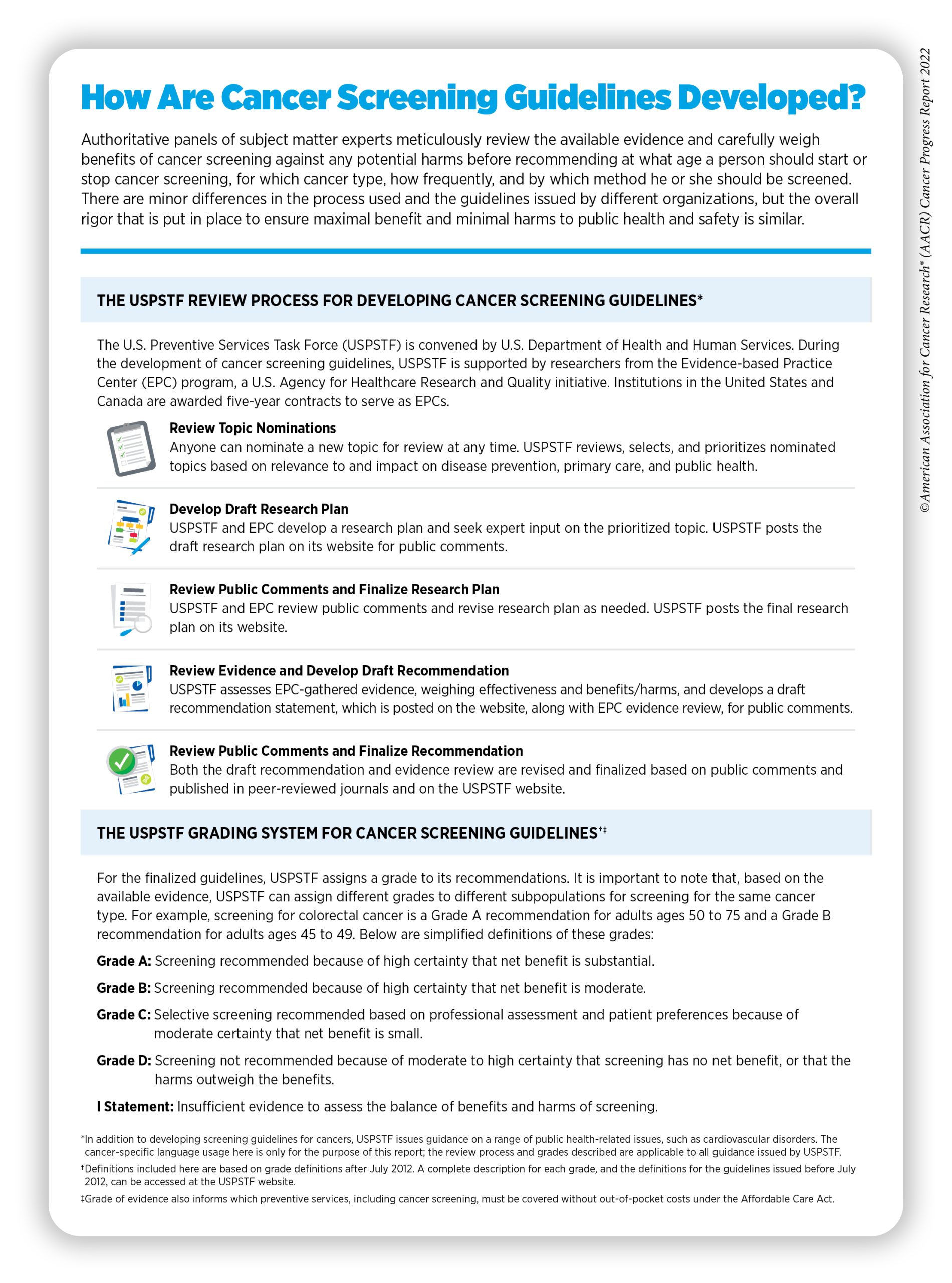 In the U.S., guidelines for cancer screening are meticulously developed by multiple authoritative groups and professional societies. For example, an independent group of experts convened by the Agency for Healthcare Research and Quality of the U.S. Department of Health and Human Services carefully evaluates data regarding the benefits and potential harms of different approaches to disease prevention, including cancer screening tests, genetic testing, and preventive therapeutics, to make evidence-based recommendations about the use of these in primary care settings. These volunteer experts form USPSTF (see sidebar on How Are Cancer Screening Guidelines Developed?).