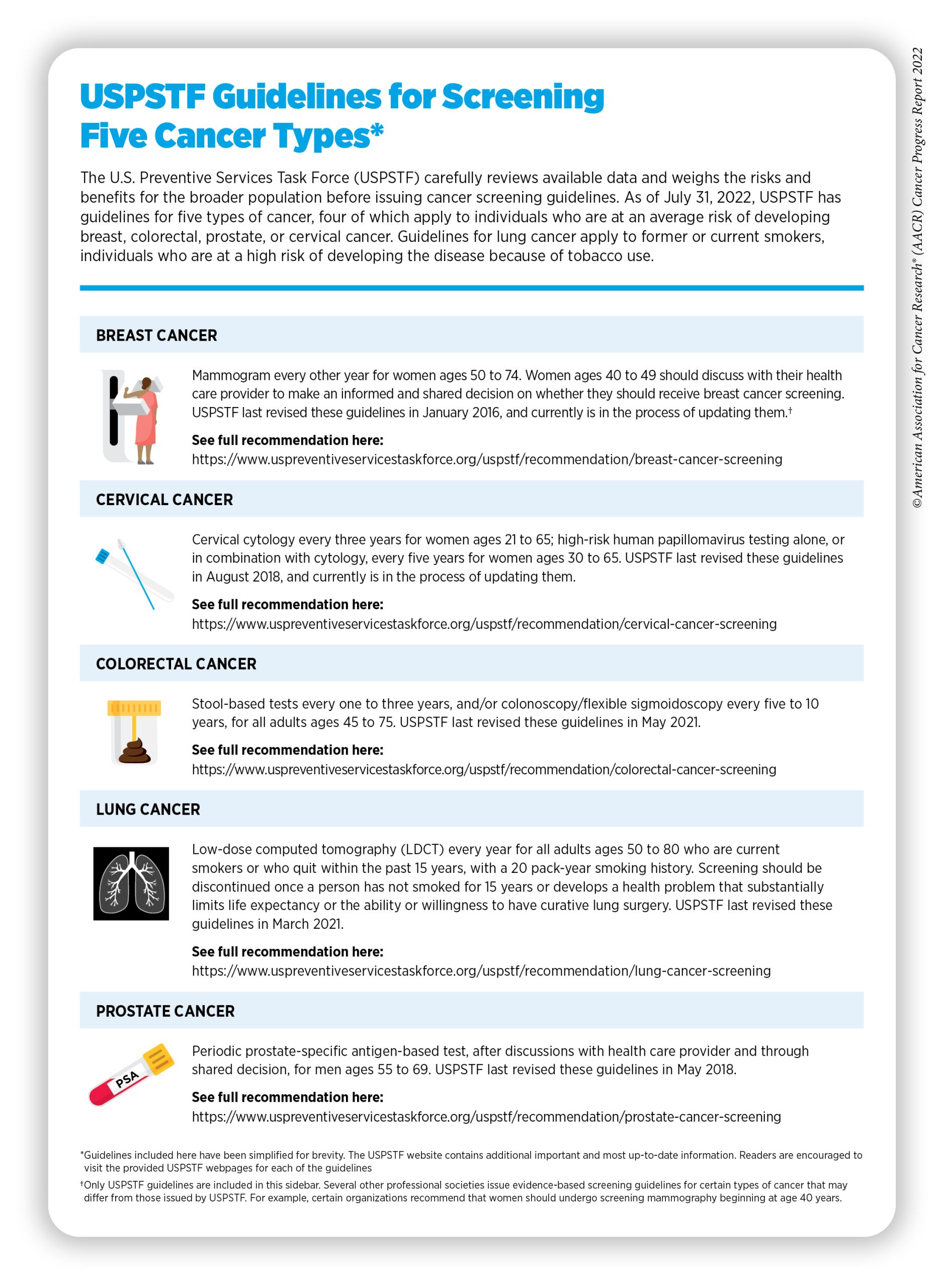 While being up to date with routine cancer screening guidelines is key to early detection, it is also important to know when an individual should stop screening for cancer. USPSTF guidelines include the age past which the potential harms from screening tests are likely to outweigh a net benefit (see sidebar on USPSTF Guidelines for Screening Five Cancer Types). However, overscreening, e.g., the use of screening tests beyond the recommended age, is common. As one example, researchers found that at least half of older U.S. adults in 2018 had received at least one unnecessary screening test for breast, cervical, or colorectal cancer in the past few years (265)Moss JL, et al. Geographic Variation in Overscreening for Colorectal, Cervical, and Breast Cancer Among Older Adults. JAMA Netw Open 2020;3:e2011645. [LINK NOT AVAILABLE]. There is also evidence that continuing cancer screening beyond the recommended age may be beneficial for some older adults (266)Brawley OW. On Breast Cancer Screening in Older Women. Ann Intern Med 2022;175:127-8. [LINK NOT AVAILABLE]. It is of utmost importance that older adults make an informed and shared decision with their provider whether to continue screening for cancer that is tailored to their health status and life expectancy, as well as to their specific exposure to genetic, environmental, and and modifiable risk factors (267)Kotwal AA, et al. Cancer Screening Among Older Adults: a Geriatrician’s Perspective on Breast, Cervical, Colon, Prostate, and Lung Cancer Screening. Curr Oncol Rep 2020;22:108. [LINK NOT AVAILABLE](268)Schoenborn NL, et al. Racial disparities vary by patient life expectancy in screening for breast, prostate, and colorectal cancers. J Gen Intern Med 2020;35:3389-91. [LINK NOT AVAILABLE](269)Schoenborn NL, et al. Preferred clinician communication about stopping cancer screening among older us adults: Results from a national survey. JAMA Oncol 2018;4:1126-8. [LINK NOT AVAILABLE].