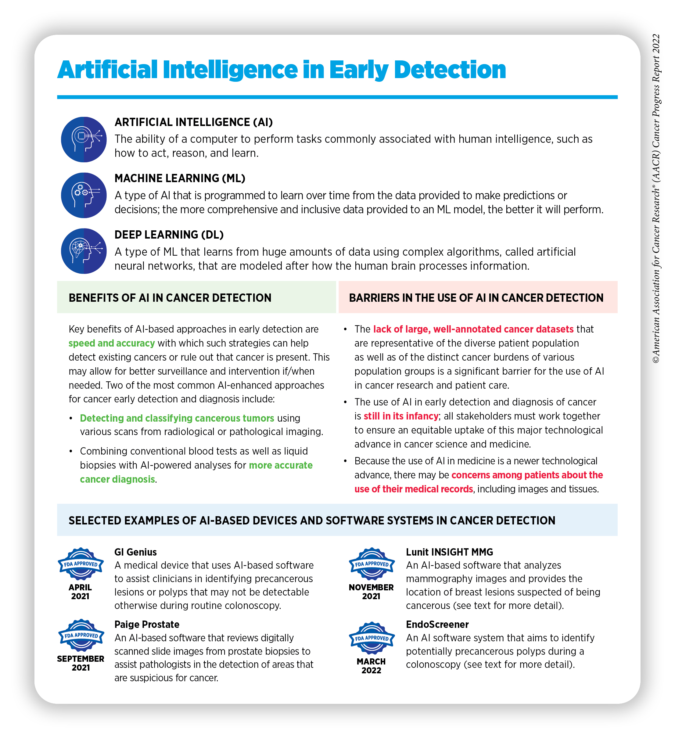 Although additional research is needed, some of the AI-driven medical devices and software have proven to be highly accurate and effective in clinical trials. From August 1, 2021, to July 31, 2022, the 12 months covered by this report, FDA approved many AI-enhanced software systems for assisting clinicians in detecting cancers early. Here, we are using examples of two such software systems—Lunit INSIGHT MMG and EndoScreener—to highlight the rapid advancement in this exciting area of cancer research.