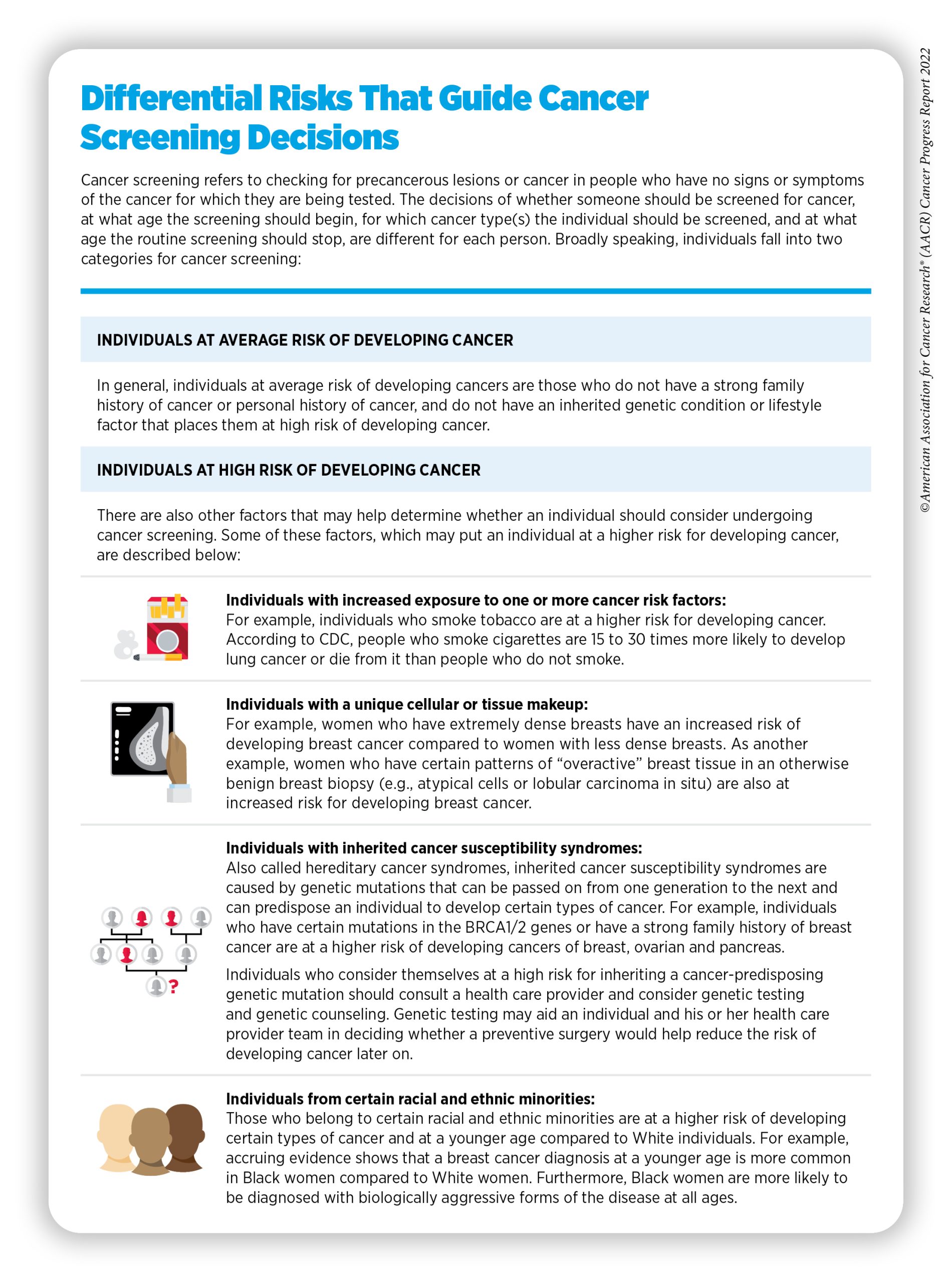 A person’s risk of developing cancer is determined by many factors including inherited, environmental, and lifestyle influences, some of which may change throughout life. Thus, the decision of whether someone should be screened for cancer, at what age, and for which cancer type(s) is different for each person and may change over the course of their lives (see sidebar on Differential Risks That Guide Cancer Screening Decisions). It is important that people consult with their health care providers to develop a personalized cancer screening plan that considers their risk of developing a cancer and their tolerance for the potential harms of a screening test.