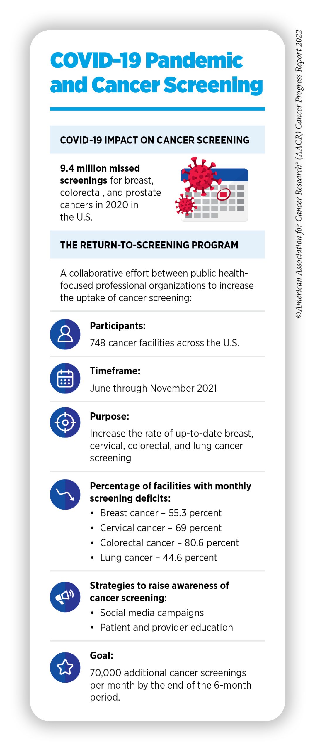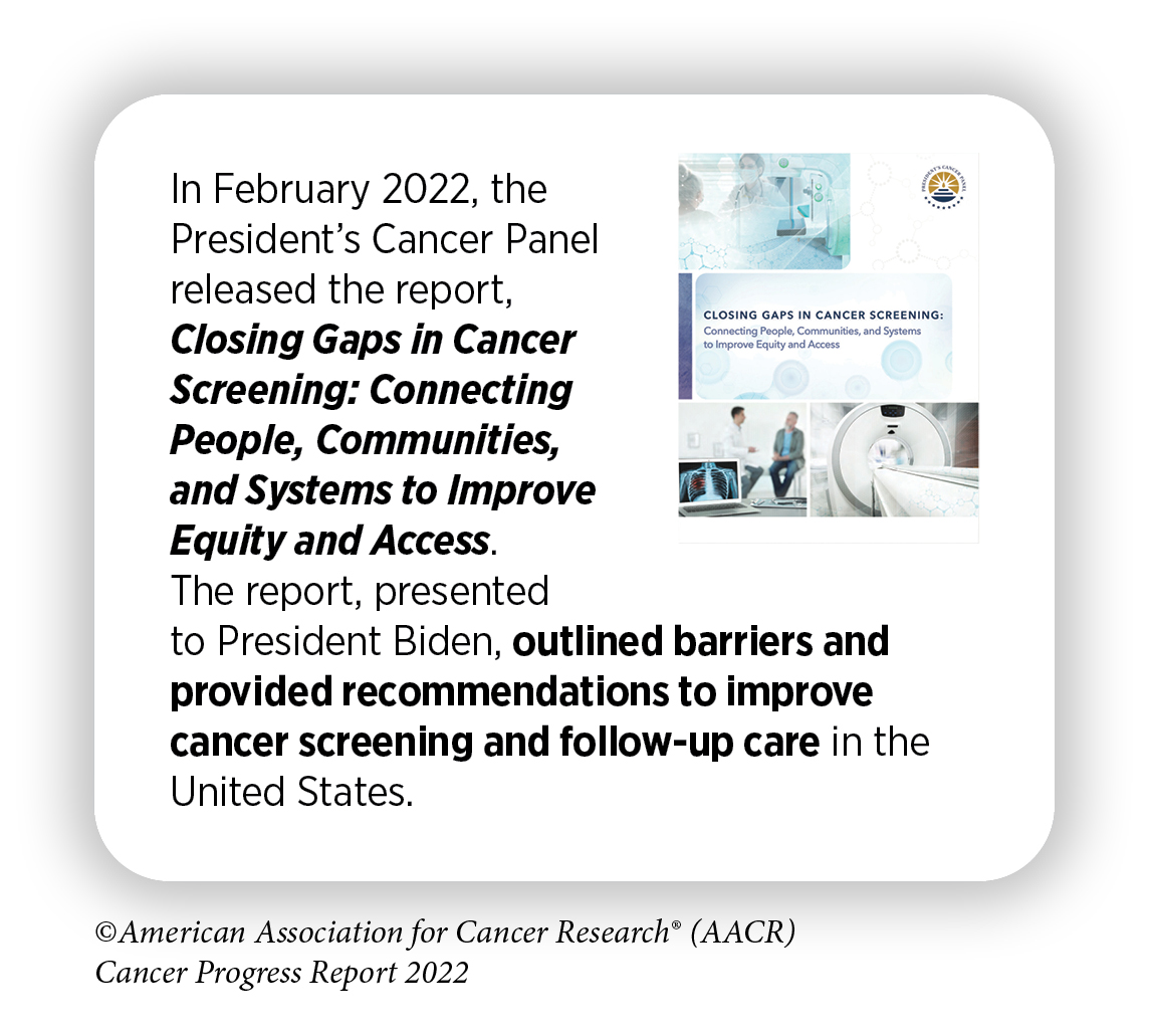As detailed in the AACR Report on the Impact of COVID-19 on Cancer Research and Patient Care, released in February 2022, severe interruptions in routine cancer screening, especially during the initial months of the pandemic, may have exacerbated the existing disparities in cancer screening (8)American Association for Cancer Research. AACR Report on the Impact of COVID-19 on Cancer Research and Patient Care. Accessed: June 30, 2022.[cited 2020 Jul 15].. Screening rates for all five cancers declined significantly during the peaks of COVID-19, although more recent data indicate that screening rates for some cancer types are returning to prepandemic levels. Furthermore, professional organizations are teaming up to help increase the uptake of cancer screening that has been impacted by the pandemic (see sidebar on COVID-19 Pandemic and Cancer Screening).
