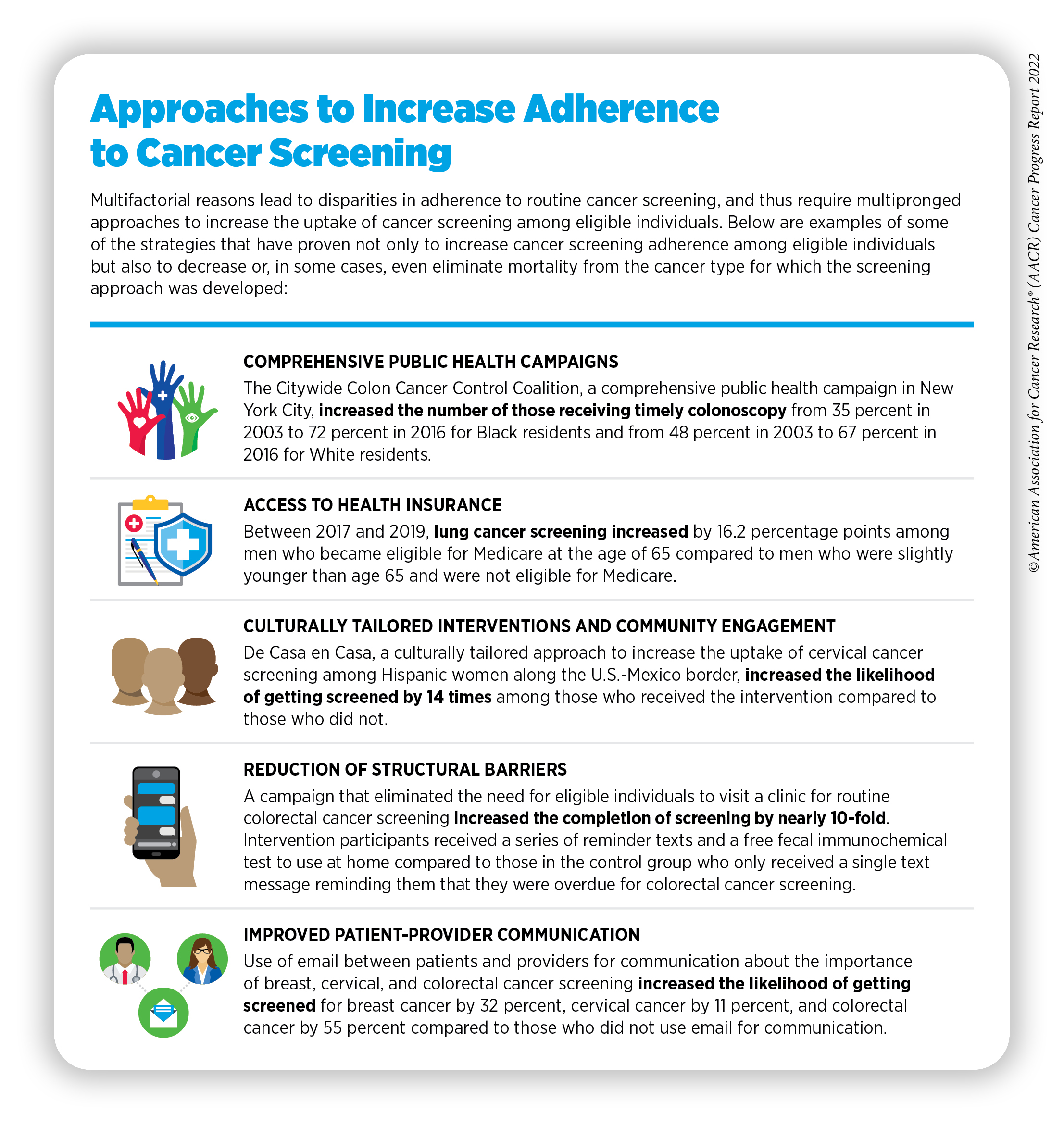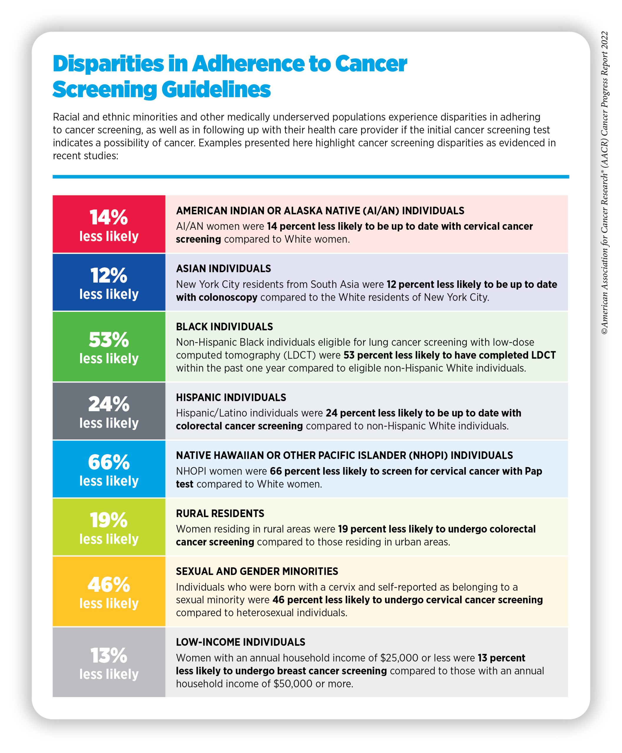 As highlighted in the AACR Cancer Disparities Progress Report 2022, released in June 2022, cancer screening rates are substantially lower among those from racial and ethnic minorities and other medically underserved populations (13)American Association for Cancer Research. AACR Cancer Disparities Progress Report 2022. Accessed: June 30, 2022.[cited 2020 Jul 15].. Furthermore, screening patterns vary for different types of cancer and/or screening tests (270)Kaiser Family Foundation. Racial disparities in cancer outcomes, screening, and treatment. Accessed: July 15, 2022.[cited 2020 Jul 15].. Barriers such as access to health insurance, low health literacy, and miscommunication between patients and providers contribute to low screening rates (271)Liu D, et al. Interventions to reduce healthcare disparities in cancer screening among minority adults: A systematic review. J Racial Ethn Health Disparities 2021;8:107-26. [LINK NOT AVAILABLE].
