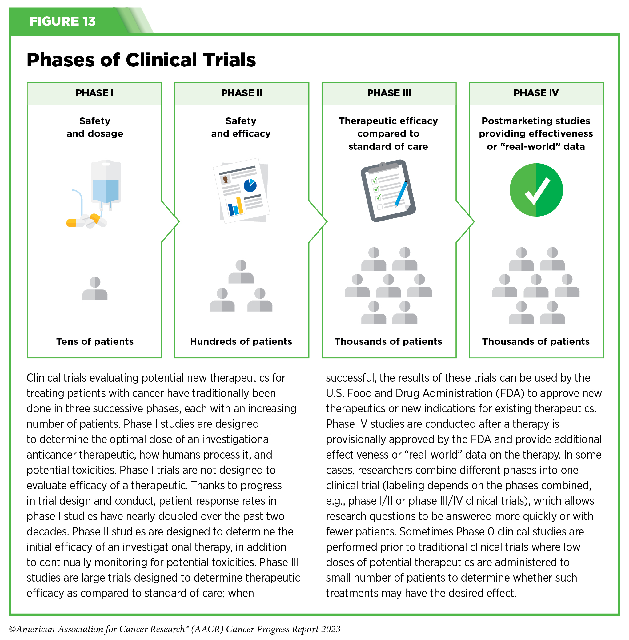 Clinical trials that test candidate therapeutics for patients with cancer have traditionally been done in three successive phases (see Figure 13). Observations made during the real-world use of a drug after it is approved by FDA can also be utilized to further enhance the use of that drug. The multiphase clinical testing process requires many patients, takes years to complete, and has a high rate of failure, making it extremely costly and one of the main barriers to rapid translation of scientific knowledge into clinical advances (326)Arfe A, et al. (2023) J Natl Cancer Inst, 115:917 [LINK NOT AVAILABLE](327)Shadbolt C, et al. (2023) JAMA Netw Open, 6: e2250996. [LINK NOT AVAILABLE]. Identifying and implementing more efficient clinical development strategies are an area of extensive investigation for all stakeholders in medical research (see Sidebar 1).