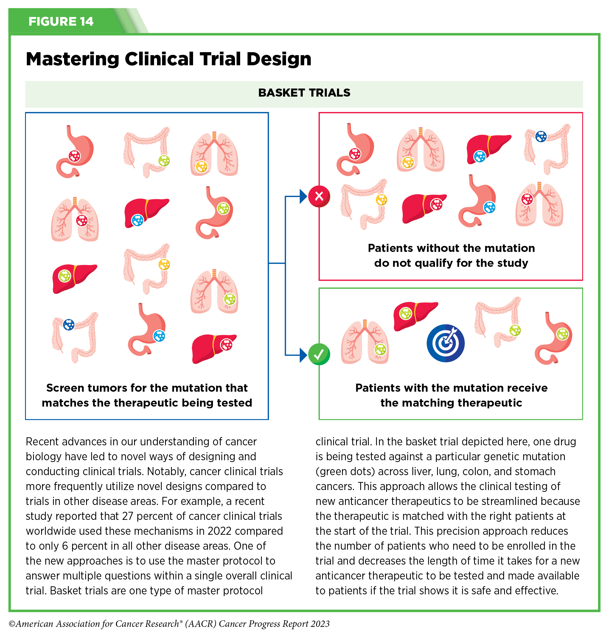 Basket trials are another example of genetic mutation–based master protocol design in clinical trials (see Figure 14). These trials allow researchers to test one anticancer therapeutic on a group of patients who all have the same type of genetic mutation, regardless of the anatomic site of the original cancer. As one example, the combination of molecularly targeted therapeutics dabrafenib and trametinib was shown to work against an array of cancer types characterized by a specific genetic feature, or biomarker, called the BRAF V600E mutation, in two recent basket trials including the NCI MATCH study (see Sidebar 9) (109)O’Dwyer PJ, et al. (2023) Nat Med, 29: 1349. [LINK NOT AVAILABLE]. Based on the data from these trials, the combination treatment received FDA approval in June 2022 and is now benefiting many patients with cancer (1)American Association for Cancer Research. AACR Cancer Progress Report 2022. Accessed: July 5, 2023. . Based on a recent analysis, the use of novel trial designs in clinical cancer research has more than tripled, worldwide, over the past decade (332)IQVIA. Global Oncology Trends 2023. Accessed: July 5, 2023. .