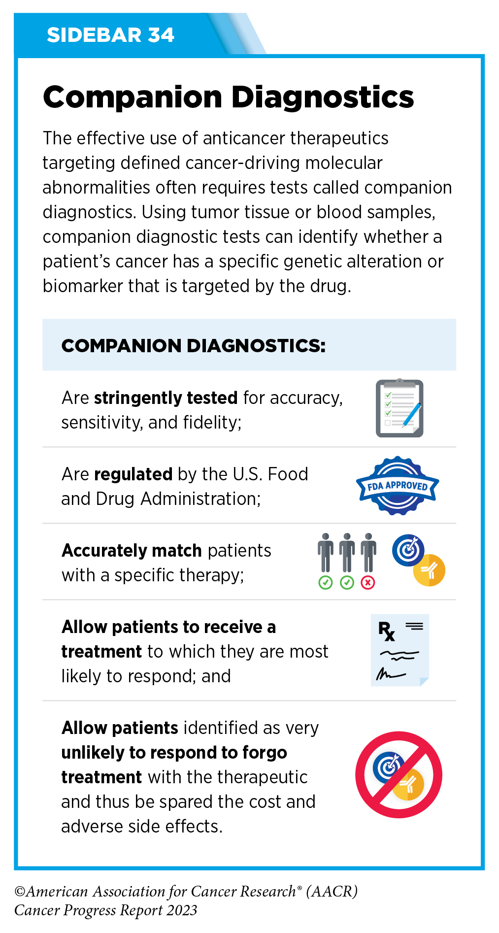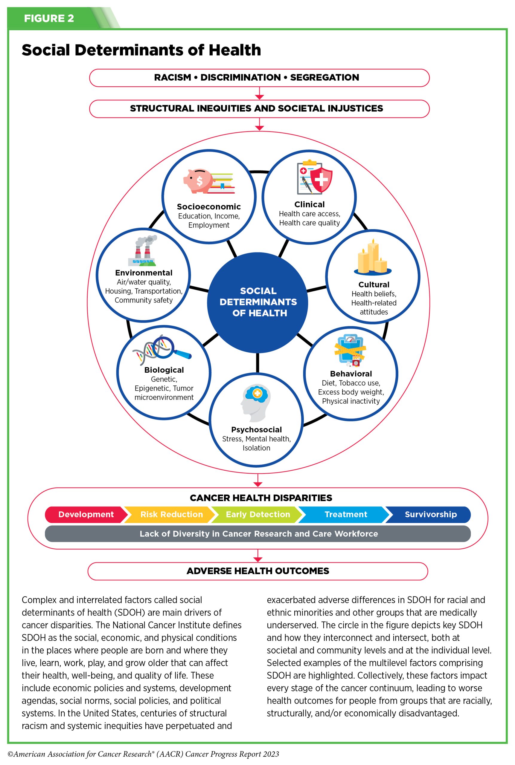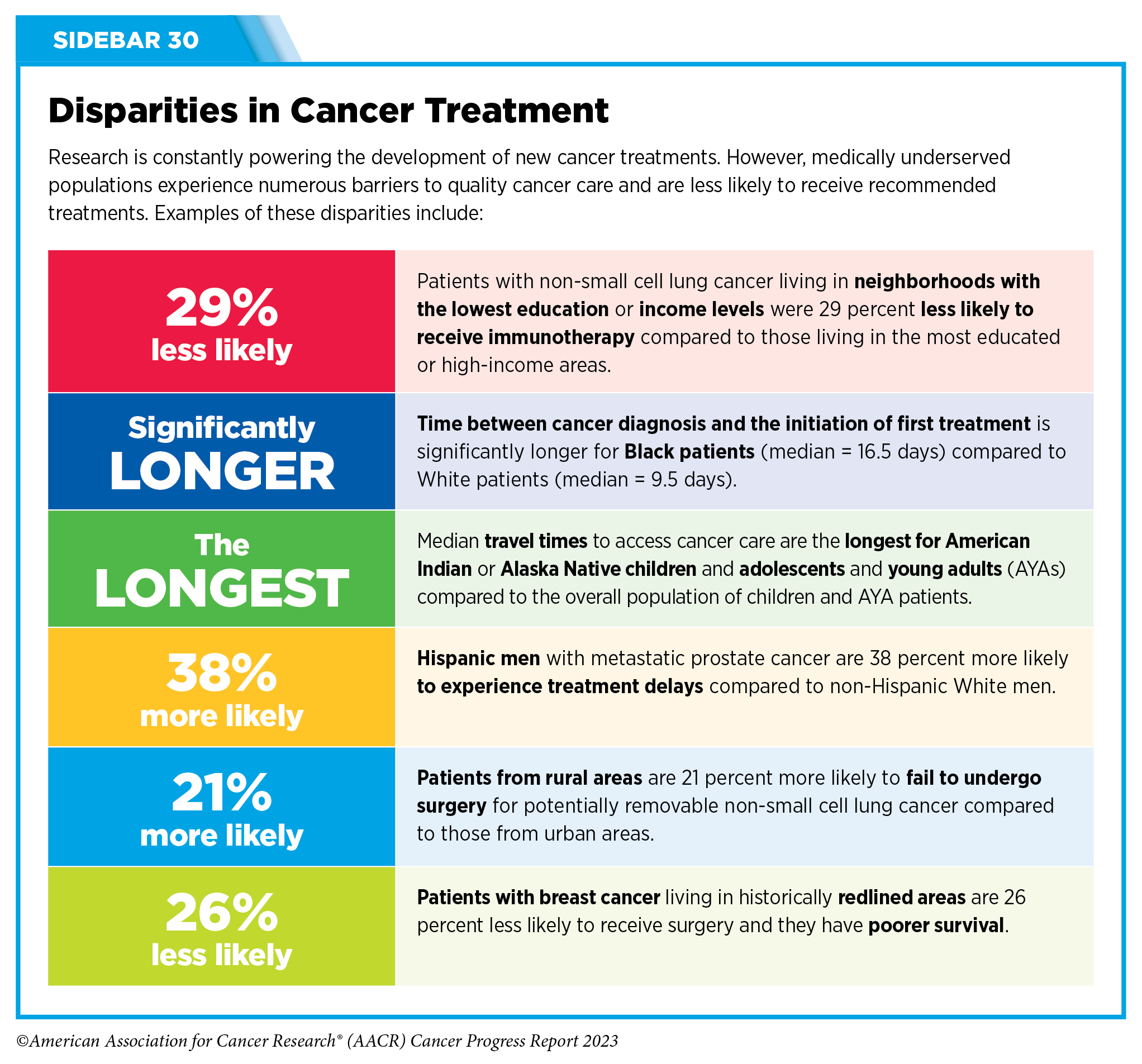 New medical products used across the continuum of clinical cancer care transform lives by improving survival and quality of life. However, not all patients receive the standard of care recommended for the type of cancer with which they have been diagnosed and the stage of cancer at the time of diagnosis (see Sidebar 30). Thus, it is imperative that all stakeholders committed to driving progress against cancer work together to address the challenge of disparities in cancer treatment because these can be associated with adverse differences in survival. Recent studies have shown that disparities in survival for prostate cancer or multiple myeloma between Black patients and White patients can be eliminated when both population groups have equivalent access to care and to standard treatments (13)American Association for Cancer Research. AACR Cancer Disparities Progress Report 2022. Accessed: June 30, 2023. .