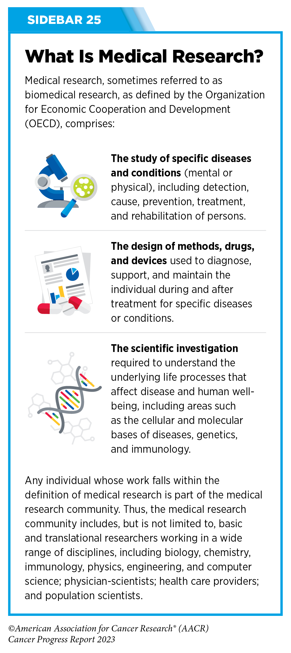 Progress across the continuum of cancer research and patient care improves survival and quality of life for people around the world. In the United States, the annual decline in overall cancer death rate among men, women, children, and adolescents and young adults has accelerated over the past two decades (see Cancer in 2023) (325)Cronin KA, et al. (2022) Cancer, 128: 4251. [LINK NOT AVAILABLE]. This progress is driven by the dedicated efforts of individuals working throughout the cycle of medical research (see Figure 4 and Sidebar 25).