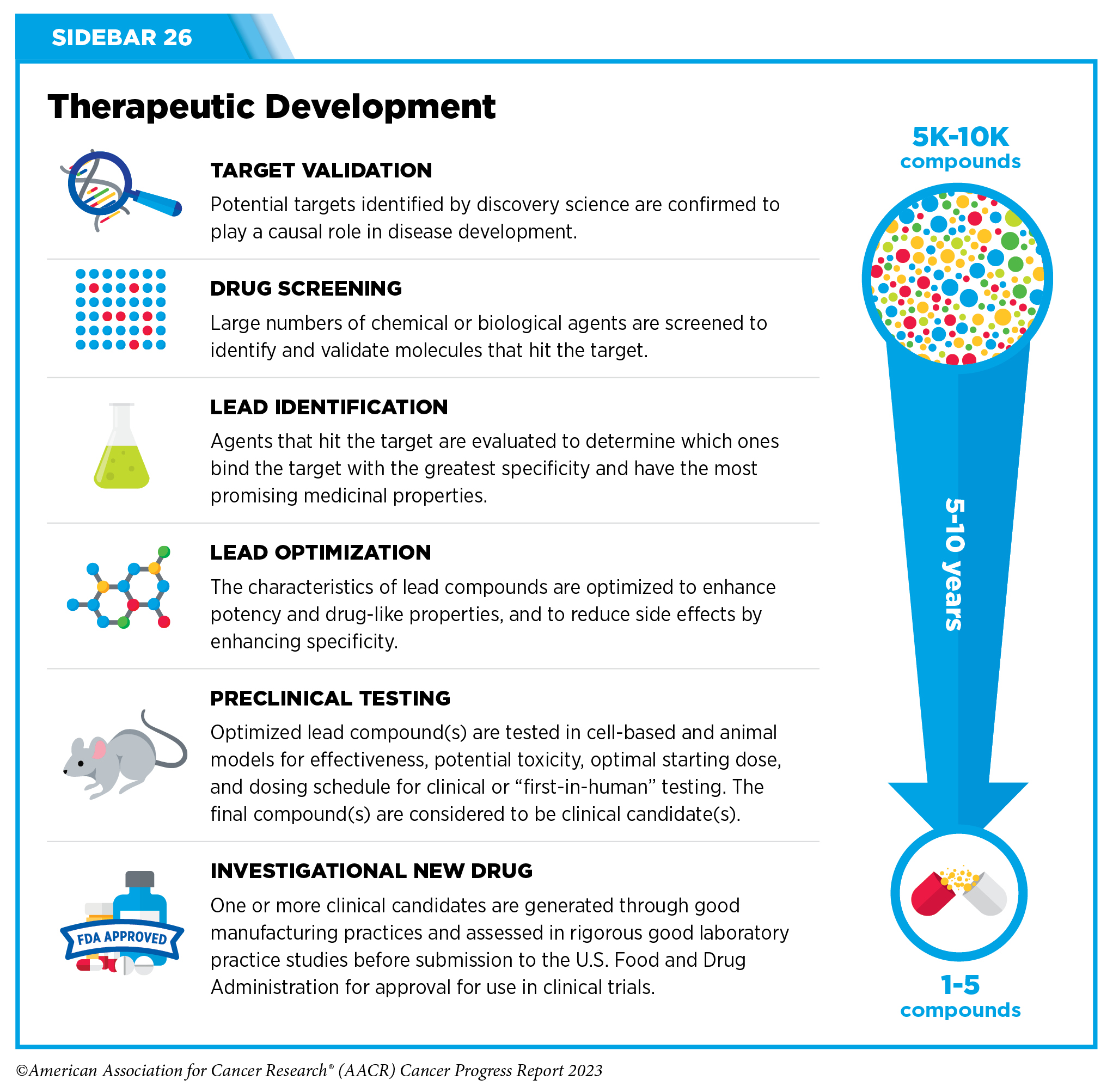 The rapid pace of progress against cancer is attributable in part to the new and effective treatments that are available today, thanks to the discoveries made through decades of research in basic and translational sciences. These discoveries have deepened our understanding of the cellular and molecular underpinnings of cancer initiation and progression and led to the identification of a range of molecular targets that drive cancer (see Understanding the Path to Cancer Development). After a potential therapeutic target is identified, it takes many more years of preclinical research before a candidate therapeutic is developed and ready for testing in clinical trials (see Sidebar 26).