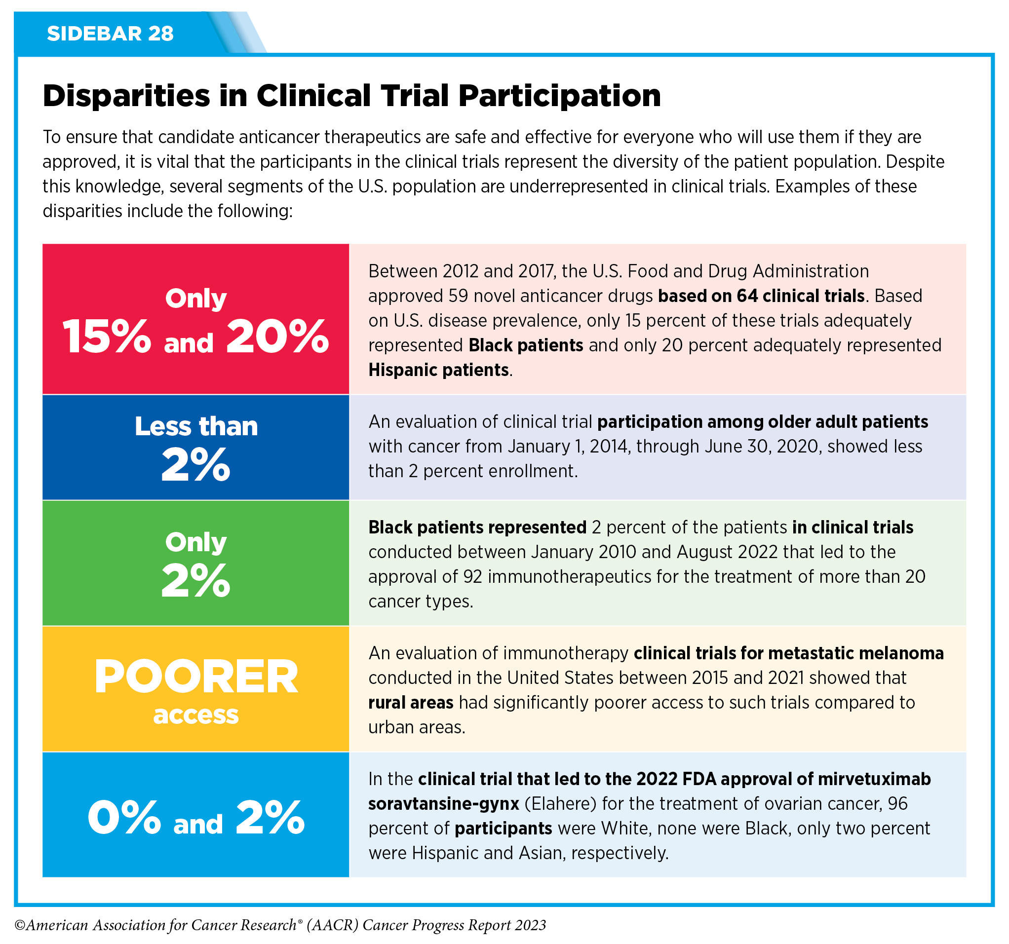 Two of the most pressing challenges that need to be overcome urgently are low participation in cancer clinical trials and a lack of sociodemographic diversity among those who do participate (see Sidebar 28). Low participation in clinical trials means that many trials fail to enroll enough participants to draw meaningful conclusions about the effectiveness of the anticancer therapeutic being tested. Lack of diversity in clinical studies means that the trial participant population does not match the actual demographics of the cancer burden under study (334)In: Bibbins-Domingo K, Helman A, editors. Improving Representation in Clinical Trials and Research: Building Research Equity for Women and Underrepresented Groups. Washington (DC)2022. [LINK NOT AVAILABLE]. Underrepresentation in clinical trials compromises the applicability of such research findings to the entire U.S. patient population.