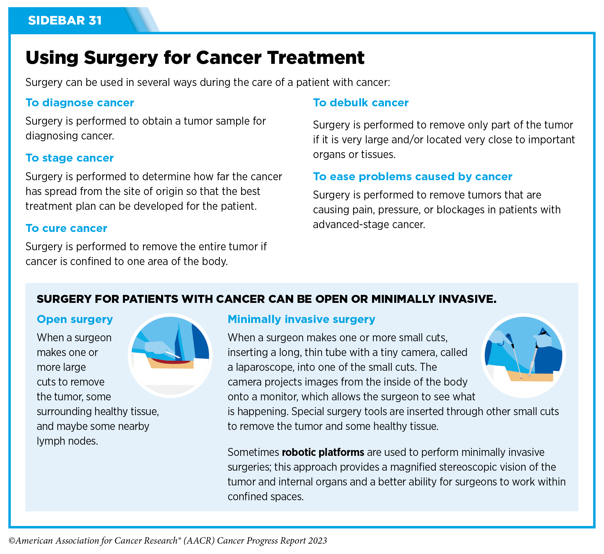 For many years, surgery was the only pillar of cancer treatment (see Figure 15). Today, it remains the foundation of curative treatment for many patients. Surgery is used in several ways during the care of a patient with cancer (see Sidebar 31).