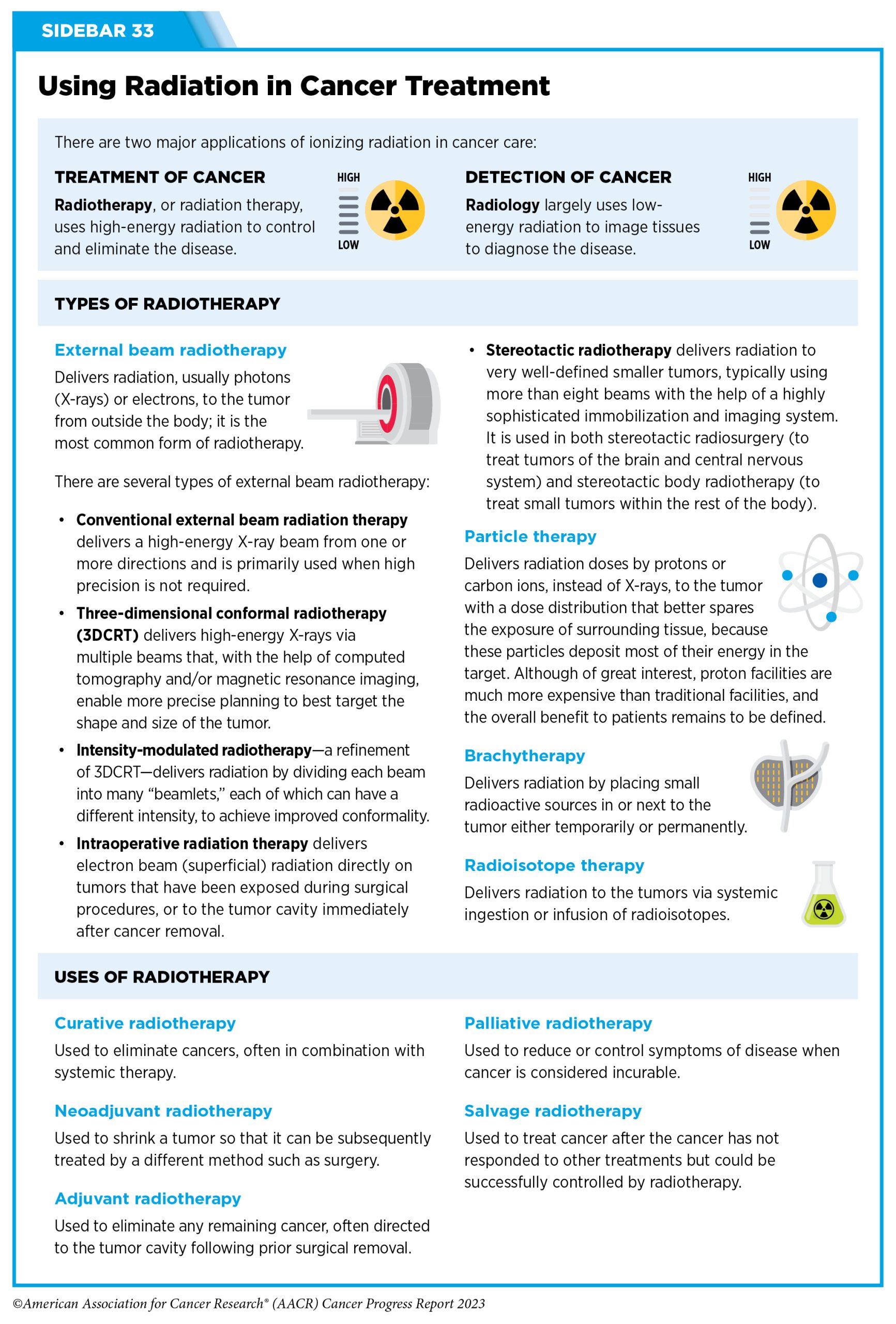 Radiotherapy is the use of high-energy rays (e.g., gamma rays and X-rays) or particles (e.g., electrons, protons, and carbon nuclei) to control or eradicate cancer. Discovery of X-rays in 1895 allowed visualization of internal organs at low doses, and the effective use of X-rays at high doses to treat a breast cancer patient a year later established radiotherapy as the second pillar of cancer treatment (see Figure 15). Radiotherapy plays a central role in the management of cancer and works primarily by damaging DNA, leading to cancer cell death. The use of radiotherapy in treatment and management of cancer continues to increase, as indicated by a 16.4 percent increase in radiation facilities across the United States between 2005 and 2020 (374)Maroongroge S, et al. (2022) Int J Radiat Oncol Biol Phys, 112: 600. [LINK NOT AVAILABLE].