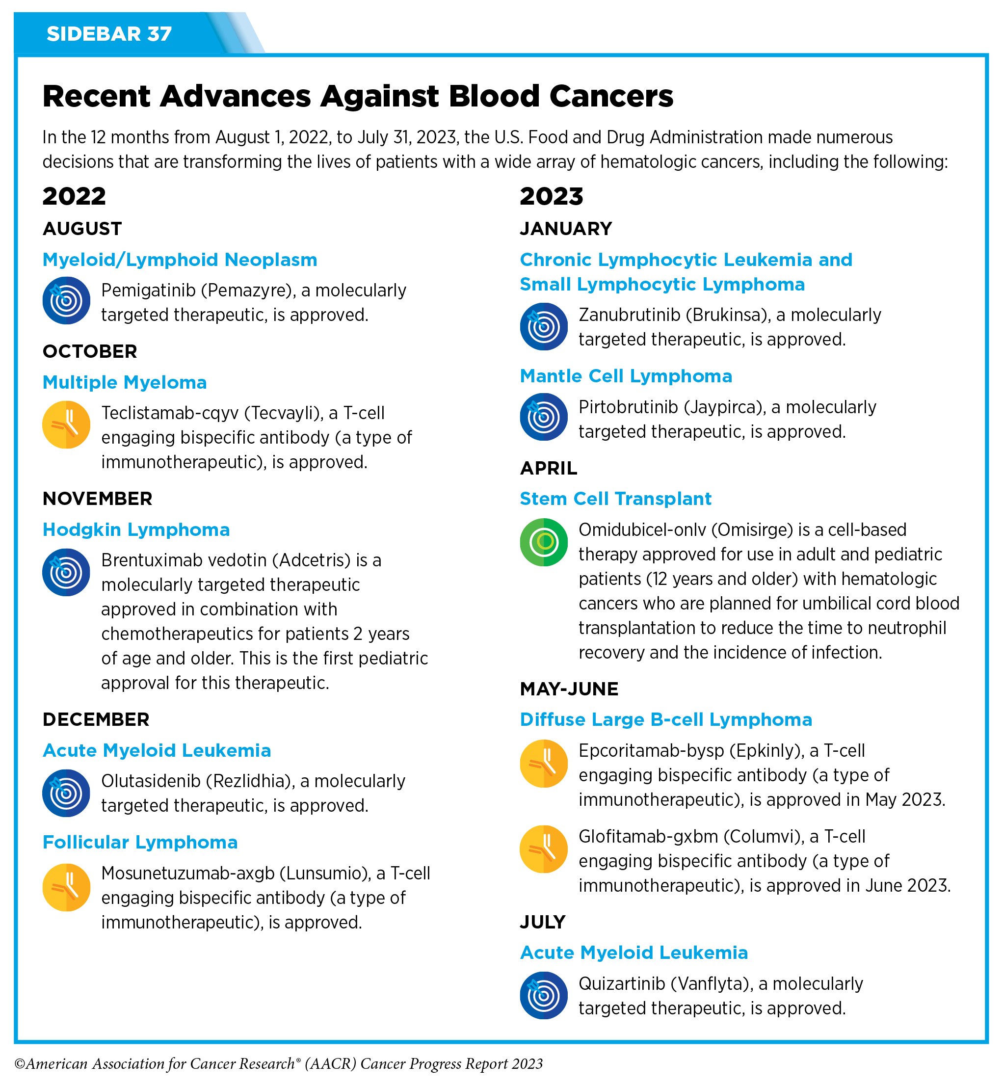 Cancers that arise in blood-forming tissues, such as the bone marrow, or in cells of the immune system, are called blood cancers, or hematologic cancers. In the 12 months covered by this report, FDA has made numerous decisions that are transforming the lives of patients with a wide array of hematologic cancers (see Sidebar 37).