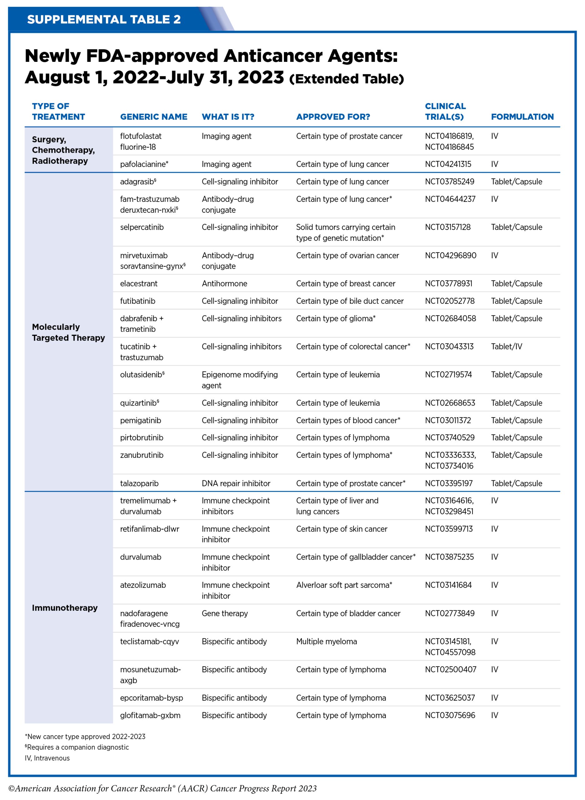 The following sections focus on the recent advances across the five pillars of cancer treatment including the 14 new anticancer therapeutics approved by the FDA in the 12 months spanning this report, August 1, 2022, to July 31, 2023 (see Table 3 and Supplemental Table 2). Also highlighted are the 12 previously approved anticancer therapeutics that received FDA approval for treating additional types of cancer in that period.
