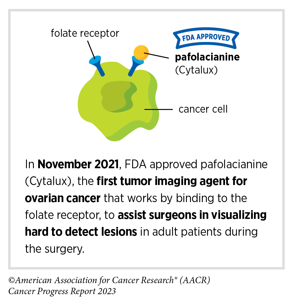 The molecularly targeted therapeutic mirvetuximab soravtansine-gynx (Elahere) targets FRα and, in November 2022, received FDA approval for adult patients with FRα positive, platinum-resistant epithelial ovarian, fallopian tube, or primary peritoneal cancer, who have received one to three prior systemic treatment regimens. FDA also approved the companion diagnostic VENTANA FOLR1 RxDx Assay to identify patients eligible for the therapy.