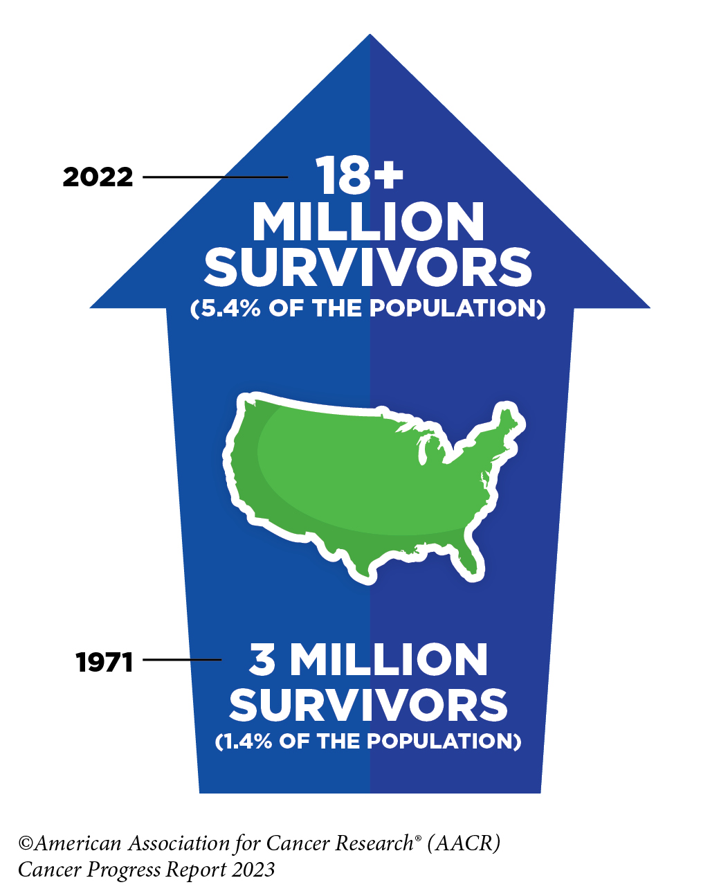 Unprecedented advances in cancer treatments over the past decade have led to more patients living longer and fuller lives after a cancer diagnosis. As of January 2022, the most recent year for which such data are available, there are more than 18 million people living with a history of a cancer diagnosis, which equates to about five percent of the U.S. population. This is a significant improvement from 50 years ago when cancer survivors constituted only 1.4 percent of the U.S. population. The number of survivors is expected to grow to 26 million by 2040. Understanding and addressing the short- and long-term challenges faced by cancer survivors, supporting their quality of life, and ensuring that care is accessible and equitable are important priorities in cancer survivorship research.