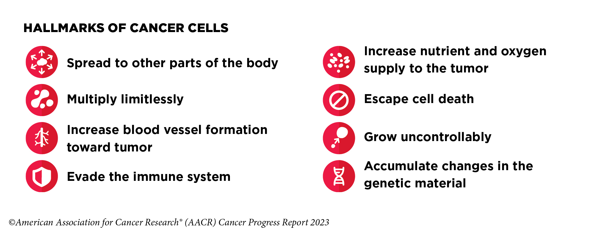Decades-long research in basic, translational, clinical, and population sciences, and the breakthroughs stemming from it, have advanced our understanding of cancer development. Insights gleaned from this knowledge have revealed cancer as a collection of diseases that are characterized by unchecked cell multiplication. We now understand that different cancer types share many so-called hallmarks or characteristics. These hallmarks are primarily acquired through alterations in the genetic material of normal cells. The nature and the type of genetic alterations determine when cancer is initiated, how fast it progresses, and where in the body it spreads.